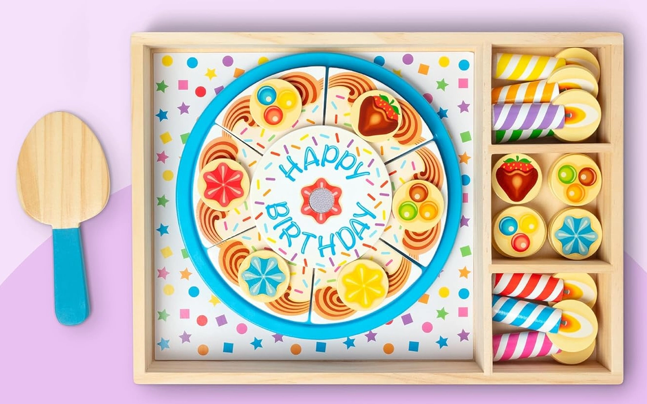 Setul include felii de tort, lumânări colorate și diverse ornamente care pot fi schimbate după dorință – fiecare sărbătoare arată altfel, iar distracția nu se termină ușor. Jocul încurajează cooperarea, împărțirea și dezvoltă motricitatea fină și imaginația.