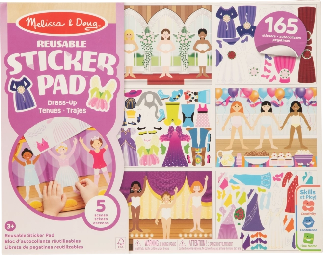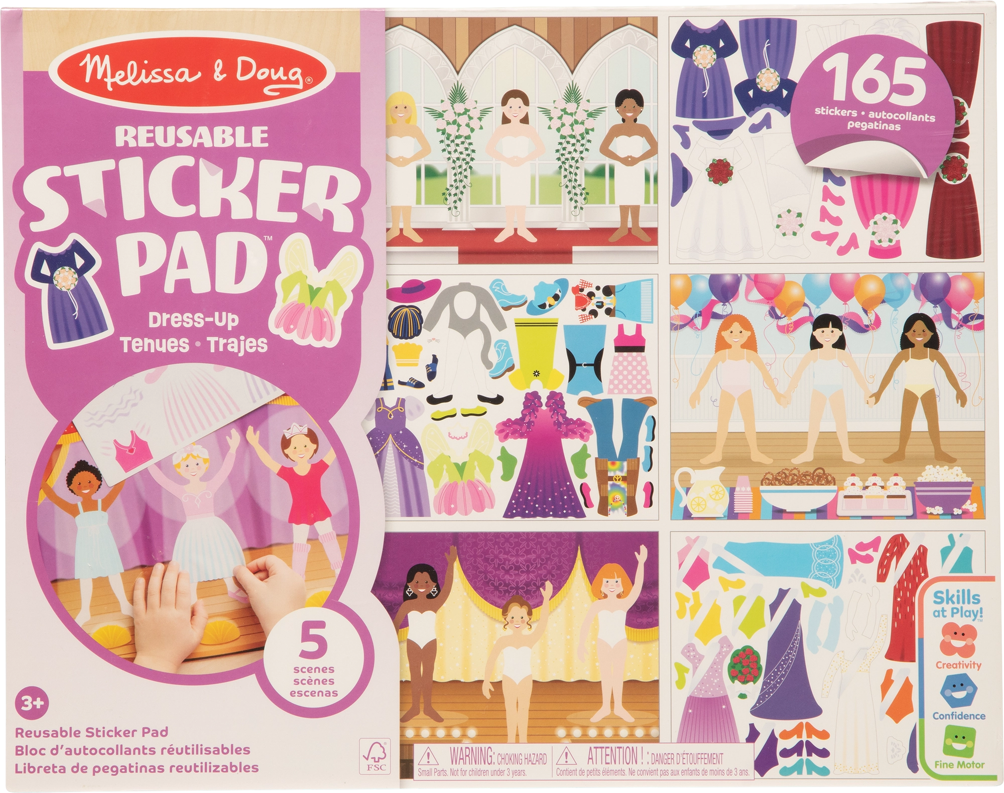 Setul creativ de autocolante de la MELISSA & DOUG oferă distracție fără murdărie. Conține 165 de autocolante reutilizabile și 5 scene mari cu fetițe de îmbrăcat. Copiii pot aplica, dezlipi și rearanja cu ușurință autocolantele, dezvoltând astfel imaginația, motricitatea fină și coordonația mână–ochi – ideal și pentru călătorii.