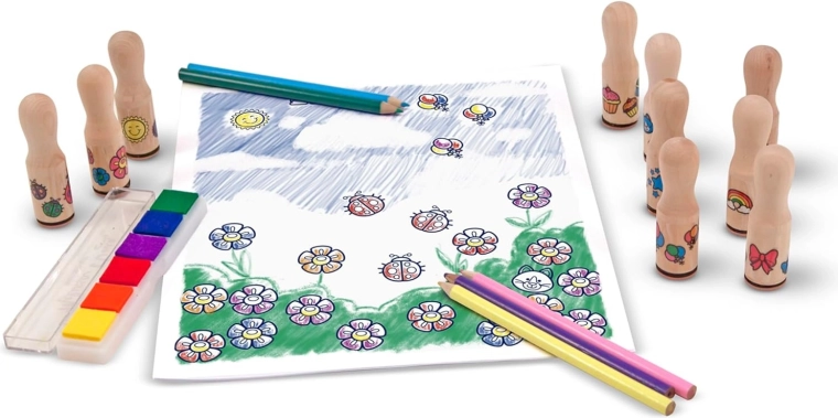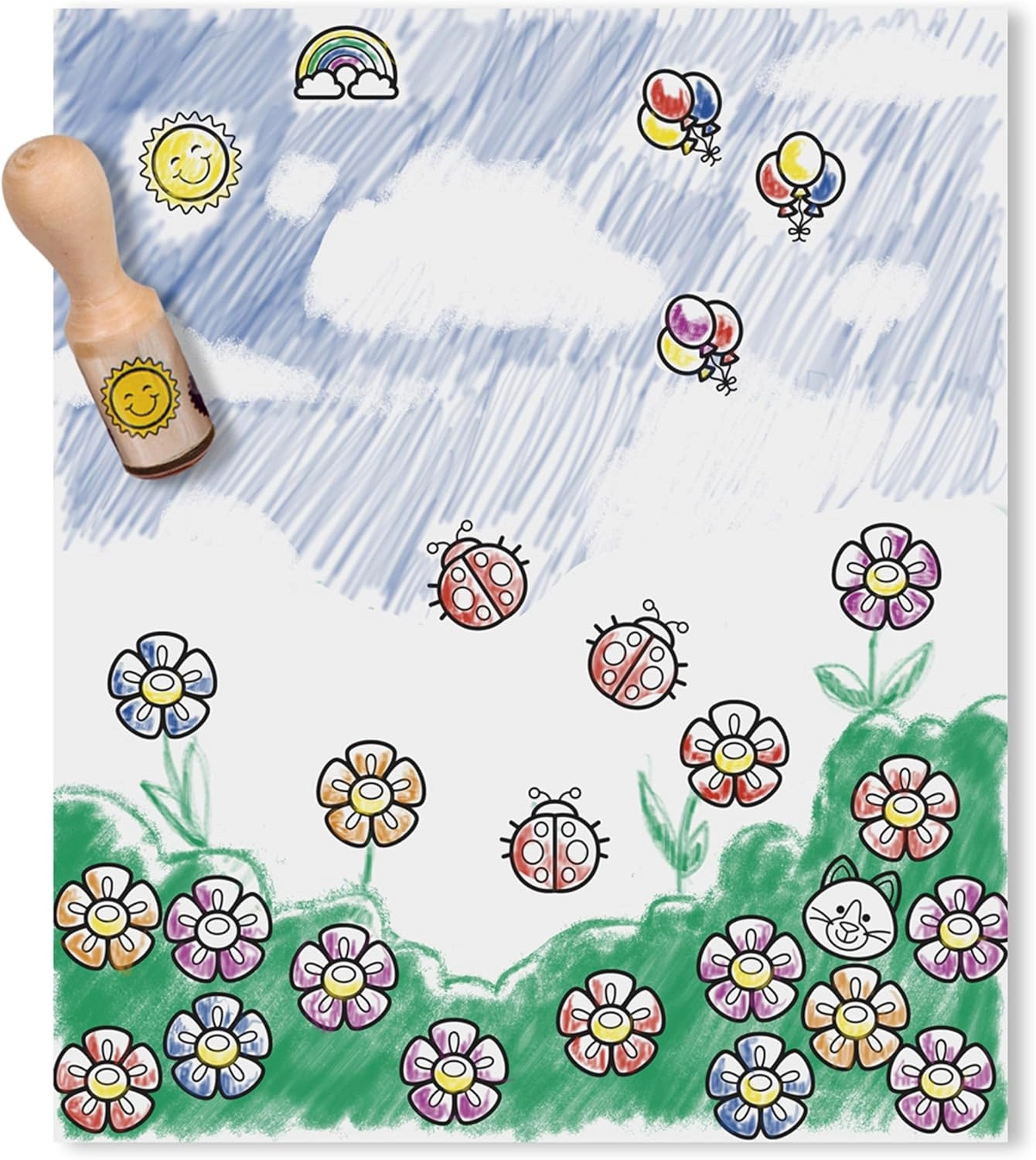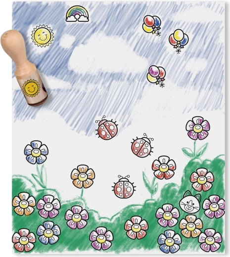 Ștampilele cu motive de soare, flori, buburuze, curcubeu și alte forme le permit copiilor să creeze cu ușurință imagini și decorațiuni vesele.