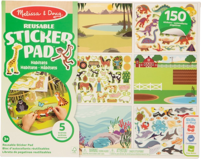 Setul distractiv de autocolante și scene Sticker Pad cu medii animale de la MELISSA & DOUG aduce 150 de autocolante reutilizabile și 5 planșe mari colorate (fermă, safari, junglă, pajiște, lumea subacvatică). Copiii își pot crea propriile povești, dezvoltând creativitatea și motricitatea fină fără mizerie – ideal și pentru călătorii.