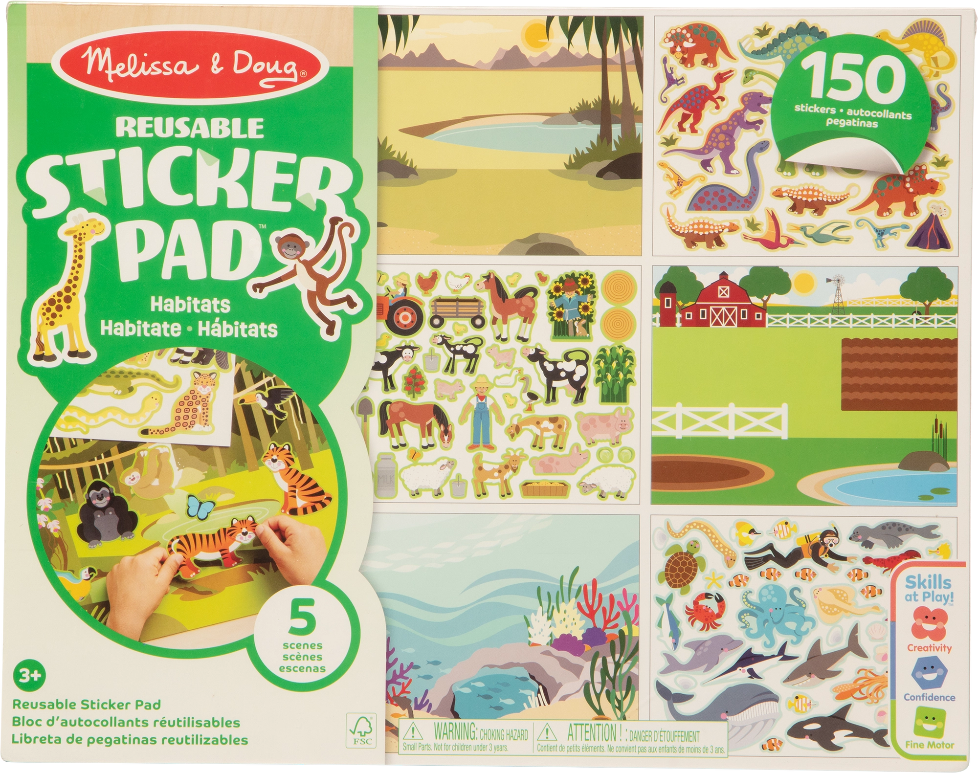 În pachet găsiți 5 scene mari cu medii îndrăgite (fermă, safari, junglă, pajiște, lumea subacvatică) și 150 de autocolante colorate cu animale și accesorii. Planșele rigide și formatul fără lipici asigură distracție curată acasă și în călătorii.