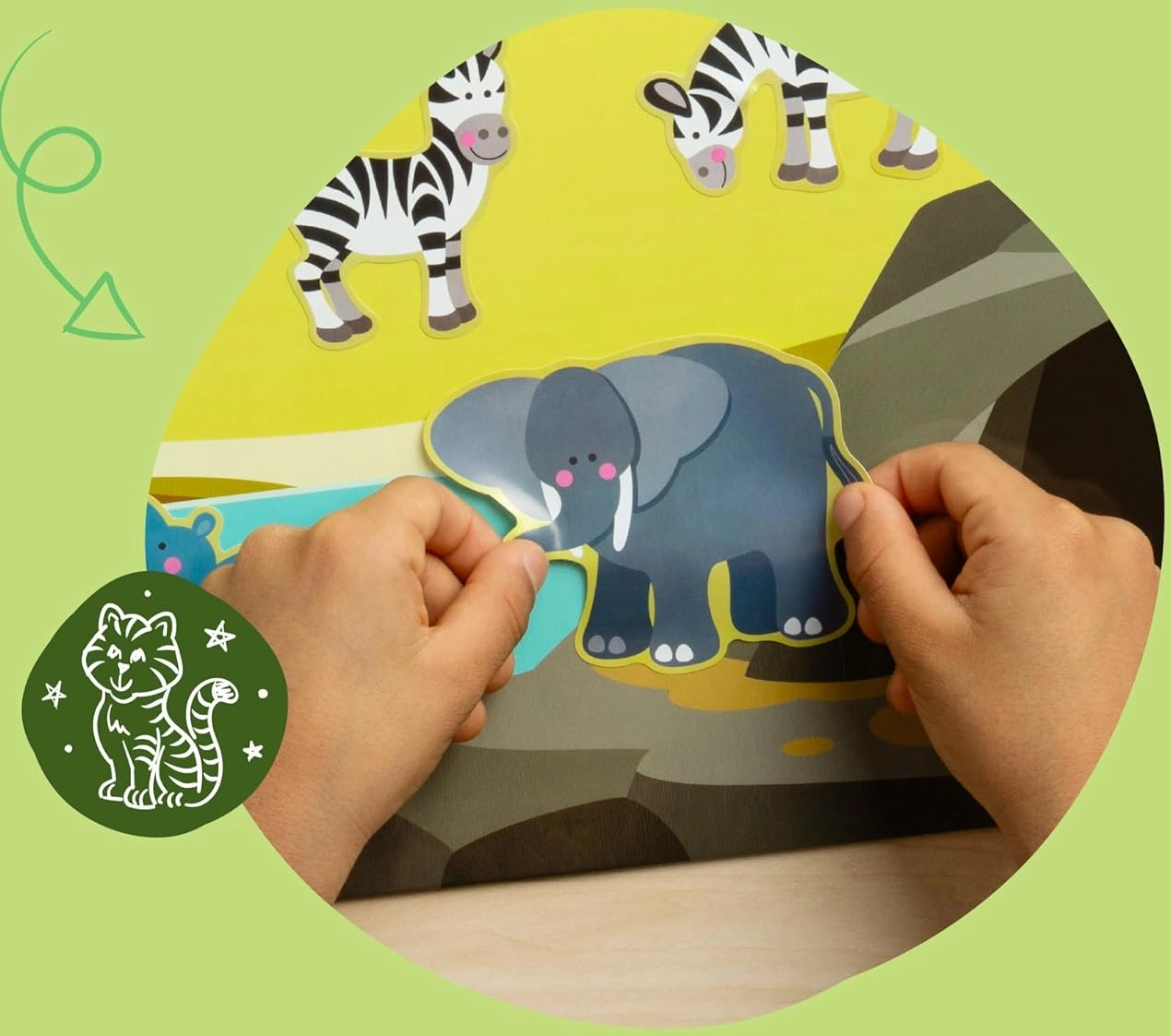 Diverse animale și accesorii pot fi lipite și repoziționate în mod repetat. Copiii își creează propriile scenete fără limite și își dezvoltă creativitatea și motricitatea fină.