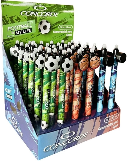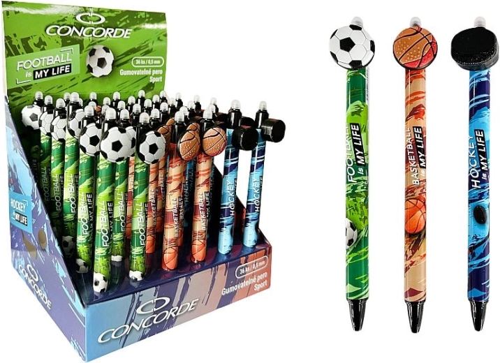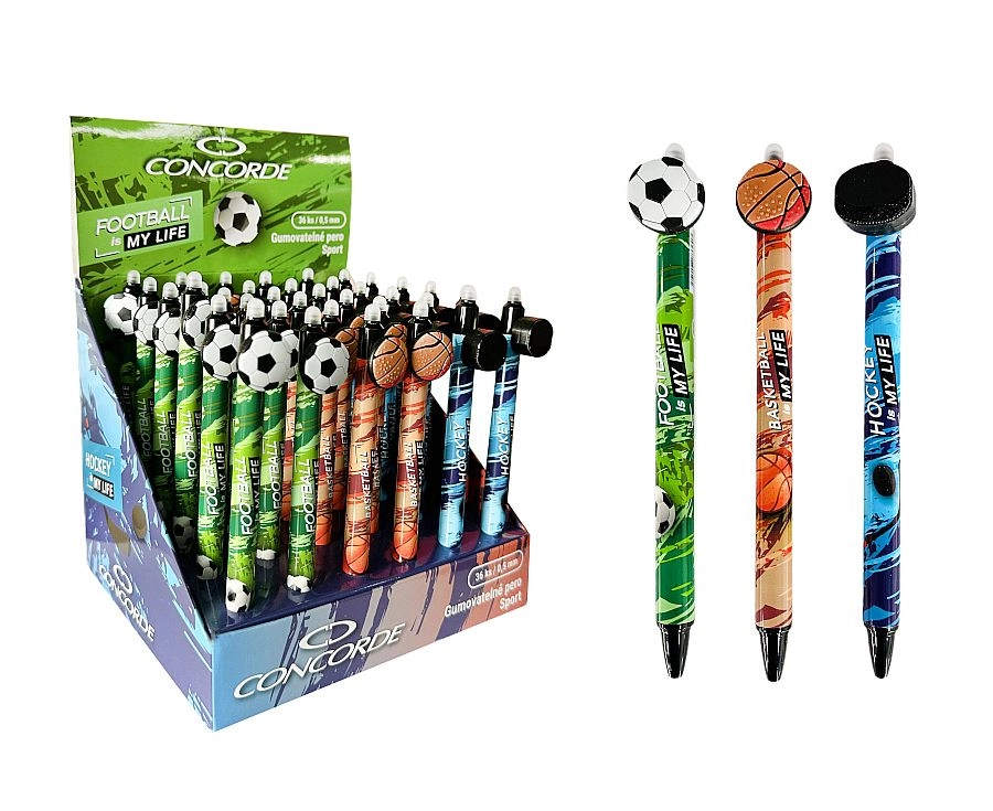 Designul cu motive sportive pe clemă (minge de fotbal și baschet, puc de hochei) îi va încânta atât pe studenți, cât și pe pasionații de sport. Pixul este compatibil cu rezerve interschimbabile, astfel încât îl puteți folosi pe termen lung, într-un mod mai ecologic.