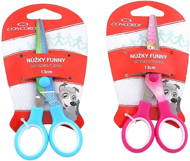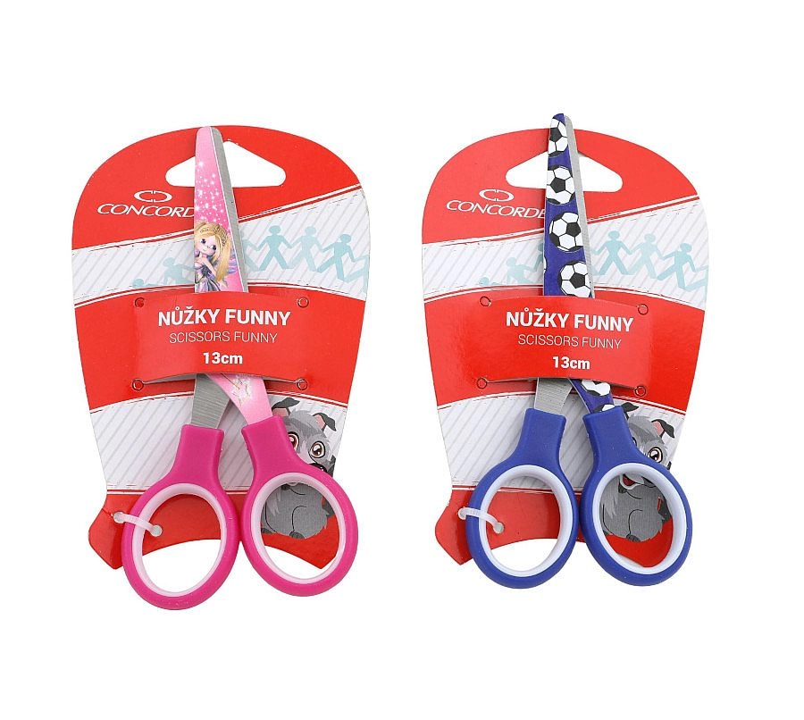 Foarfeca școlară CONCORDE Funny de 13 cm, sigură și jucăușă, îi va încânta pe copii cu imprimeuri colorate în variantă roz sau albastră. Oferă vârfuri rotunjite pentru tăiere în siguranță, priză ergonomică lată pentru o ținută confortabilă și mecanism ușor pentru tăierea facilă a hârtiei și a materialelor creative.