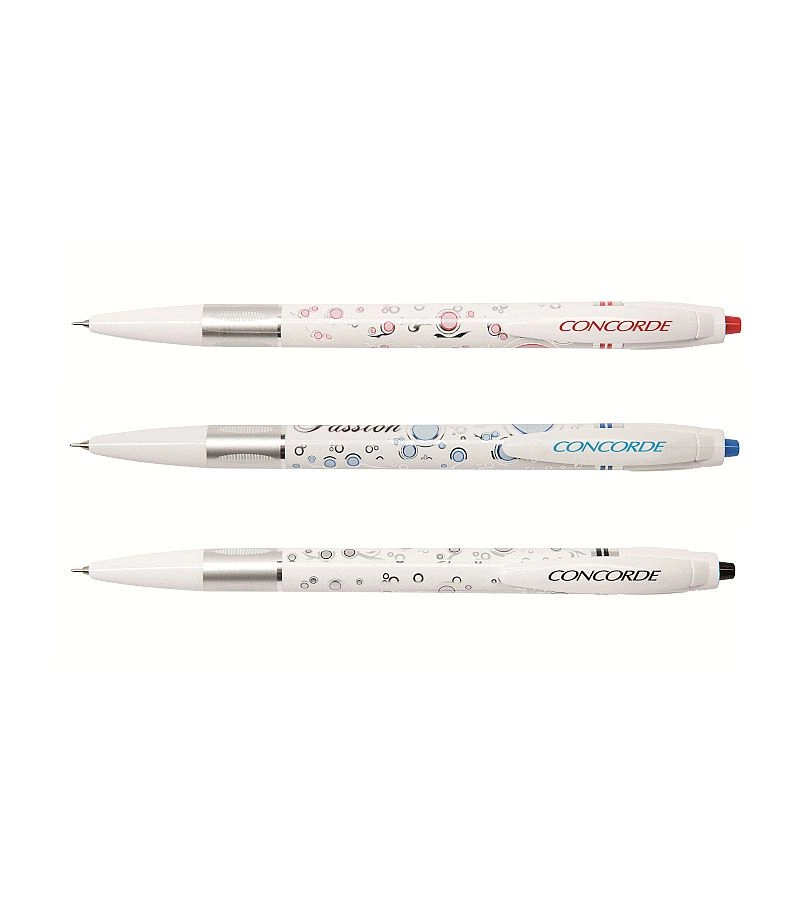 Elegantul pix cu bilă Concorde Pasiune, cu un design original, oferă scriere extrem de lină datorită rezervei japoneze speciale cu substanță gel. Dispune de vârf tip ac de 0,6 mm pentru linii precise și este livrat într-un mix de culori cu rezervă albastră. Compatibil cu rezervă de schimb Extra Fine.
