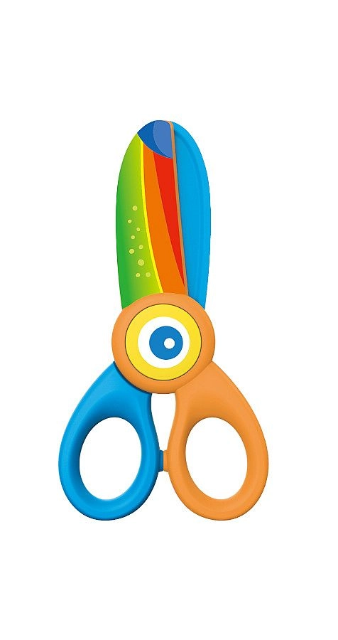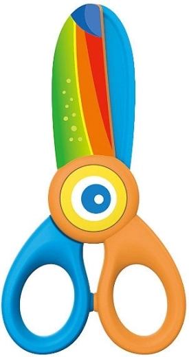 Foarfecă veselă și sigură pentru cei mici, cu motiv Tucan și lungime de 12,5 cm. Are execuție din plastic, vârf rotunjit și construcție de siguranță fără lamă metalică, ideală pentru primele tăieri. Oferă priză confortabilă și este livrată pe blister.