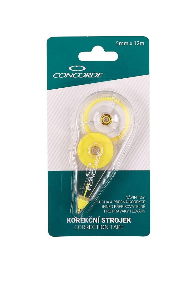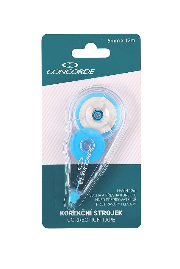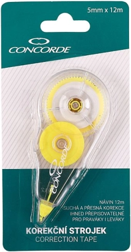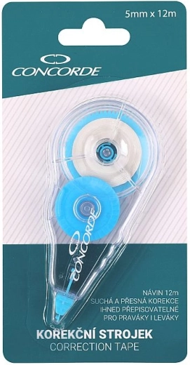Bandă corectoare practică de unică folosință CONCORDE Lungo cu lățimea de 5 mm și lungimea de 12 m pentru corecturi rapide și curate. Oferă o suprafață uscată imediat reinscriptibilă, control optic al capacității rămase și derulare lină fără rupere. Nu lasă umbre pe fotocopii și, datorită rotiței suplimentare, poți întinde cu ușurință banda.