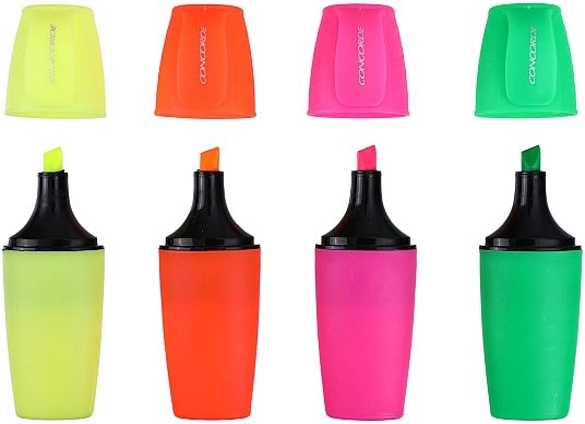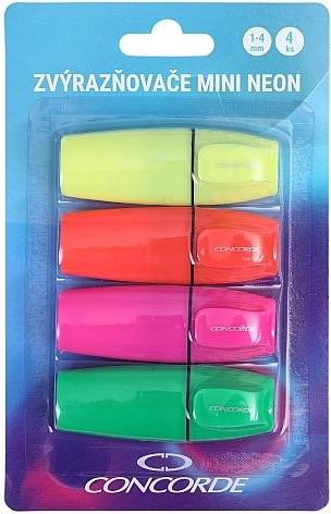 Set compact de mini evidențiatoare CONCORDE în culori neon pentru marcarea clară a textului acasă, la școală și la birou. Oferă vârf teșit 1–4 mm, clips practic pe capac și patru nuanțe intense: verde, roz, portocaliu, galben. Datorită dimensiunilor mici, încap ușor în buzunar sau penar și le veți avea mereu la îndemână.
