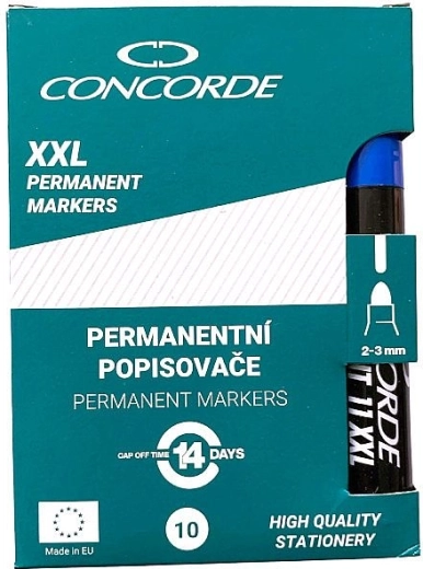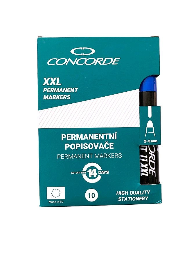 Markerul permanent CONCORDE în culoarea albastră este alegerea ideală pentru marcajul zilnic la birou, la școală și în atelier. Cerneala pe bază de alcool creează o linie intensă, opacă, care aderă excelent pe suprafețe netede și poroase și este rezistentă la apă și ștergere.