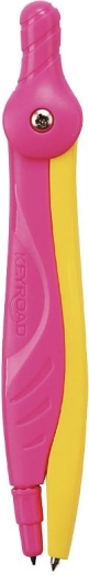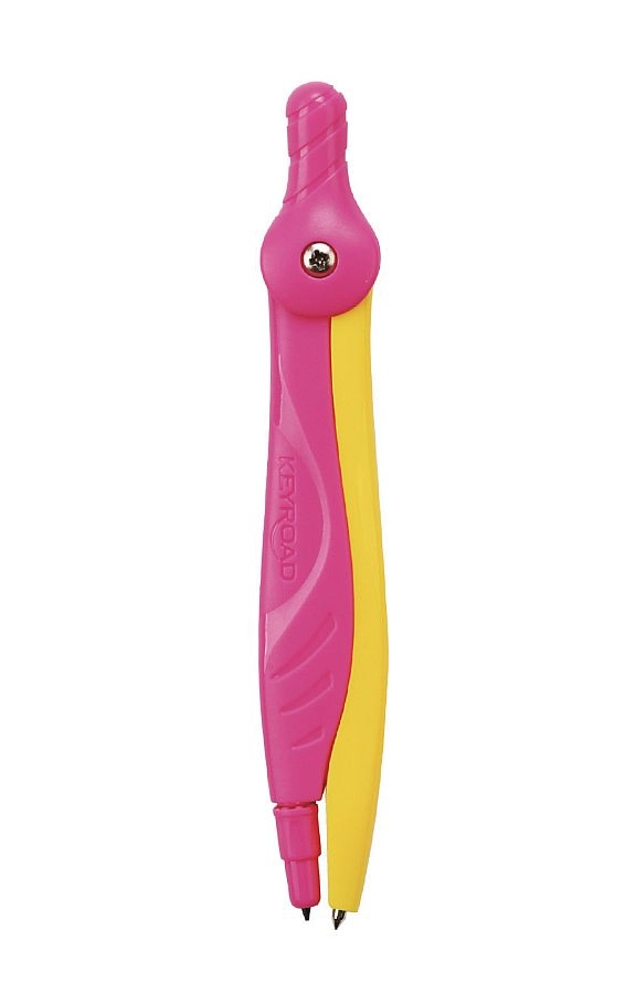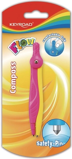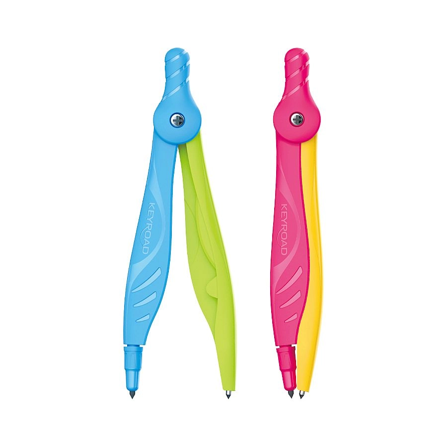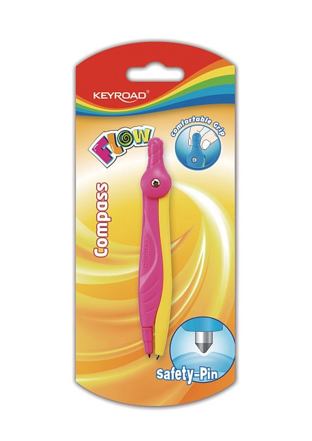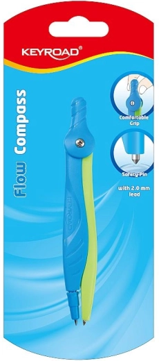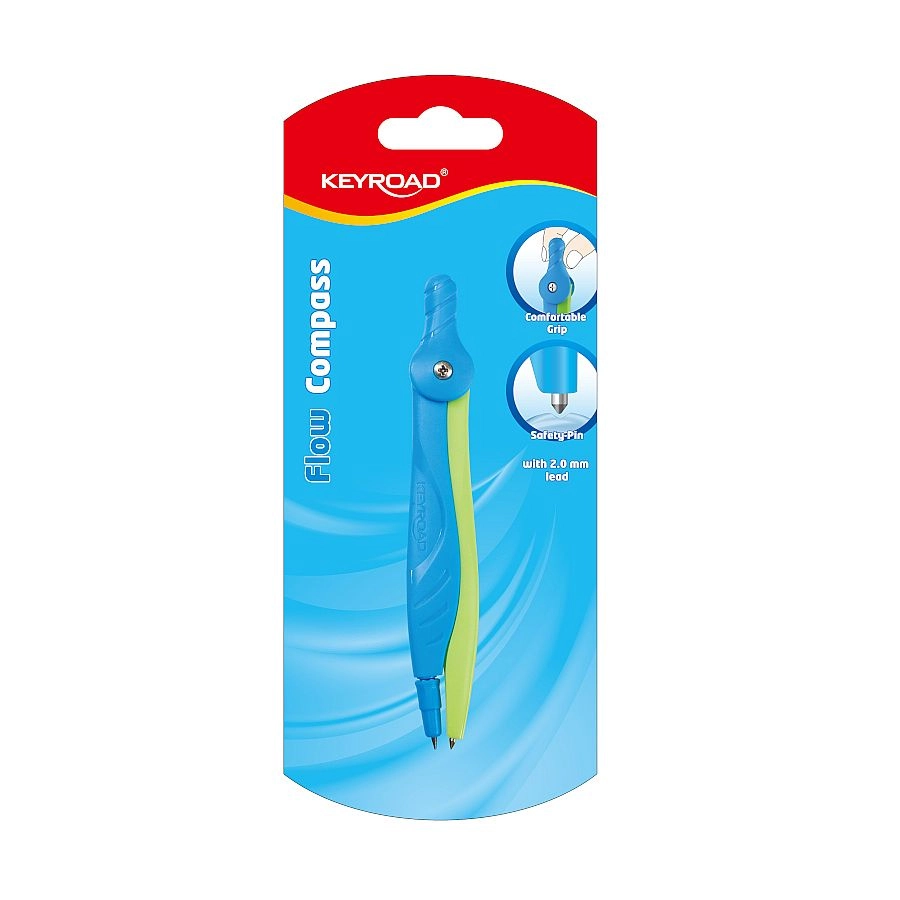 Compas școlar practic KEYROAD Flow pentru cercuri și arce precise. Oferă priză ergonomică confortabilă, vârf de siguranță pentru o utilizare mai sigură și design atractiv în două culori. Livrat pe blister, în asortiment de două culori.