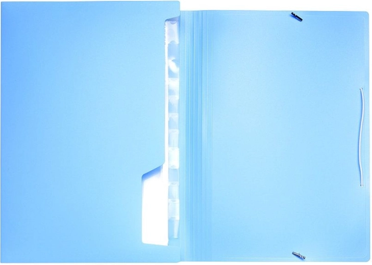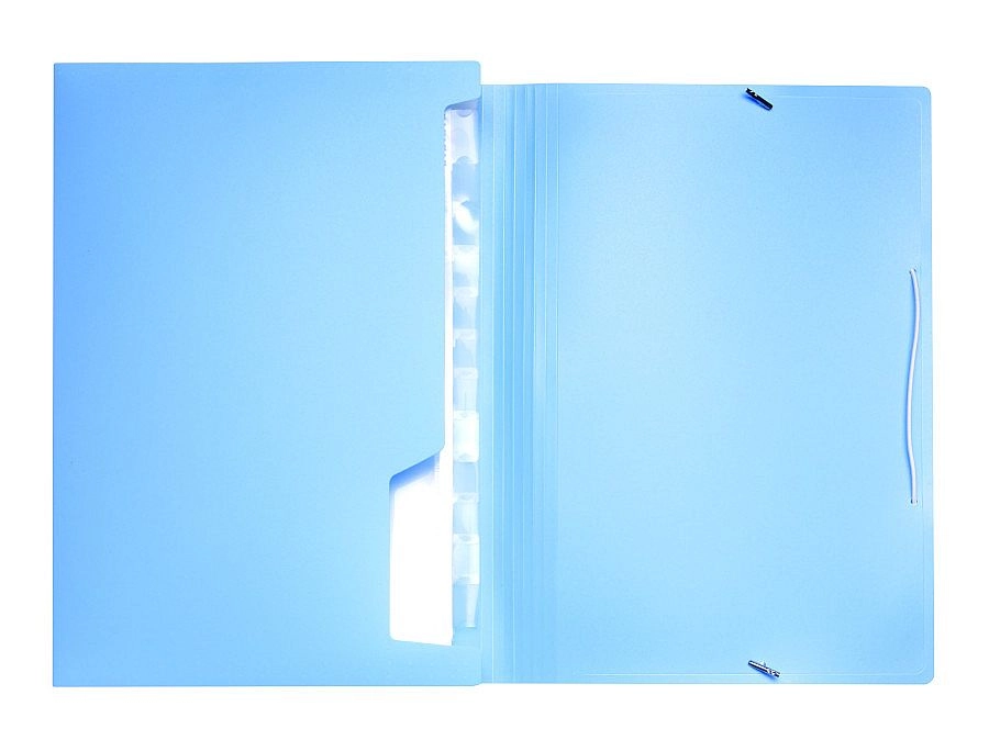 Mapă elegantă pentru documente din polipropilenă rezistentă, în culoare albastru pastel, cu elastic pentru închidere sigură. Oferă 13 compartimente pentru organizare clară a documentelor format A4 și mai mici, inclusiv etichete inserabile pentru identificarea ușoară a conținutului.
