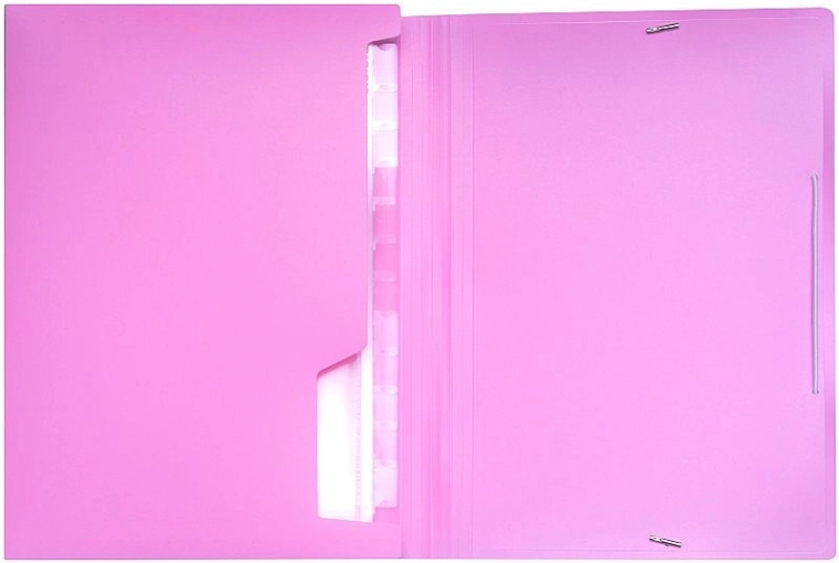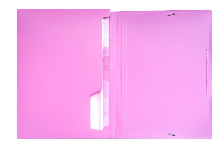 Mapă stilată pentru documente, în culoare roz pastel, pentru organizare clară și depozitare sigură. Oferă 13 compartimente pentru format A4 și documente mai mici, etichete inserabile pentru identificare rapidă și închidere sigură cu bandă elastică.