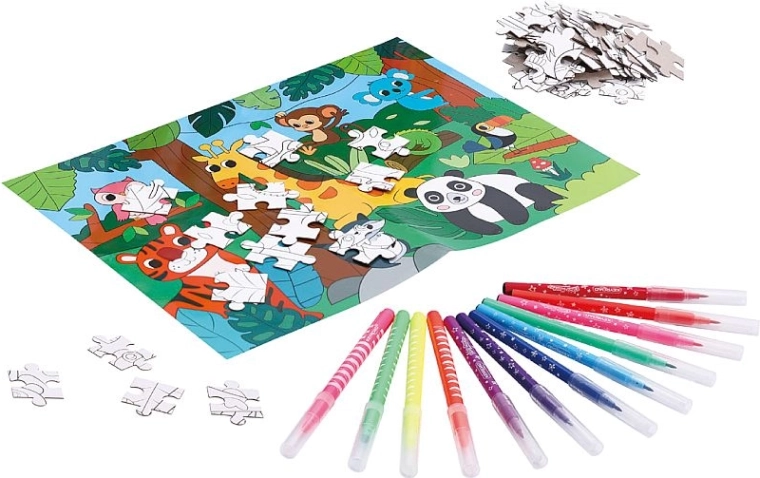 Descoperă lumea distractivă a creației cu puzzle-ul de colorat Keyroad 2în1 Junglă. Mai întâi asamblezi 88 de piese albe în formatul 38 × 28 cm, apoi transformi imaginea într-o lucrare plină de culoare. Poți crea complet după bunul plac sau poți folosi modelul inclus. Datorită celor 12 markere, inclusiv 4 neon, jungla ta va căpăta culori cu adevărat vii.