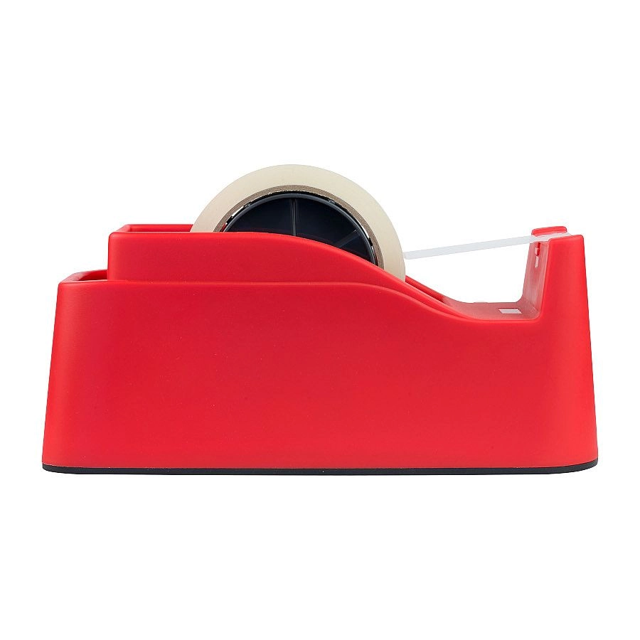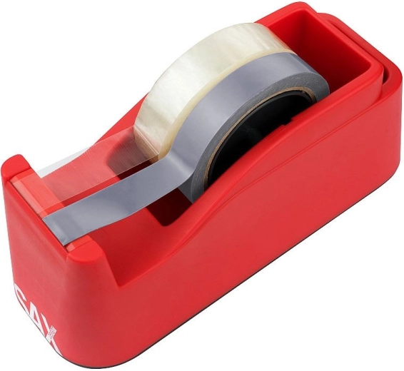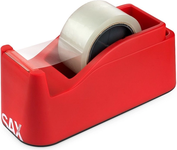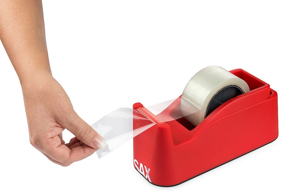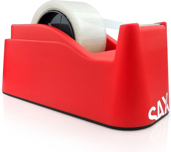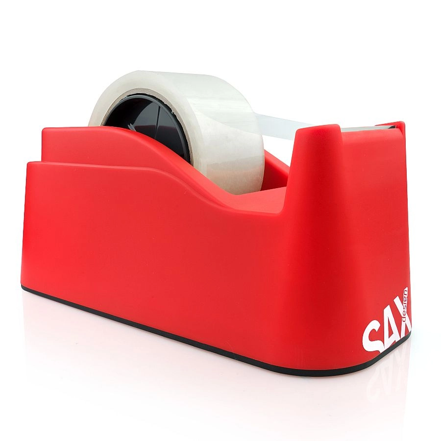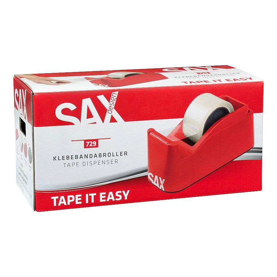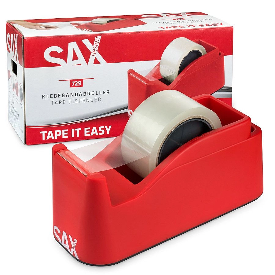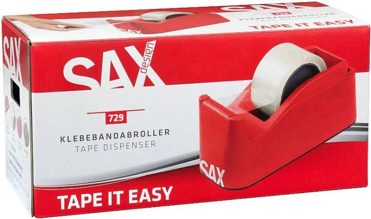 Dispenserul de bandă SAX design 729 este ideal pentru birou, depozit și casă. Datorită construcției masive și greutății de 2,2 kg rămâne stabil pe loc, astfel încât puteți rupe banda comod cu o singură mână. Construcția practică permite utilizarea unei benzi late de 50 mm sau a două benzi înguste de 25 mm, cu posibilitatea de a alege între două niveluri de încastrare pentru o derulare uniformă.