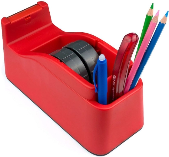 De o tăiere precisă și rapidă se ocupă cuțitul metalic ascuțit cu margine zimțată, pentru care producătorul oferă garanție pe viață. Partea din spate servește drept organizator pentru instrumente de scris – creioane, pixuri, foarfecă sau riglă vor fi mereu la îndemână. În plus, în pachet primiți bandă adezivă transparentă 50 mm × 70 m, astfel încât puteți începe imediat lucrul.