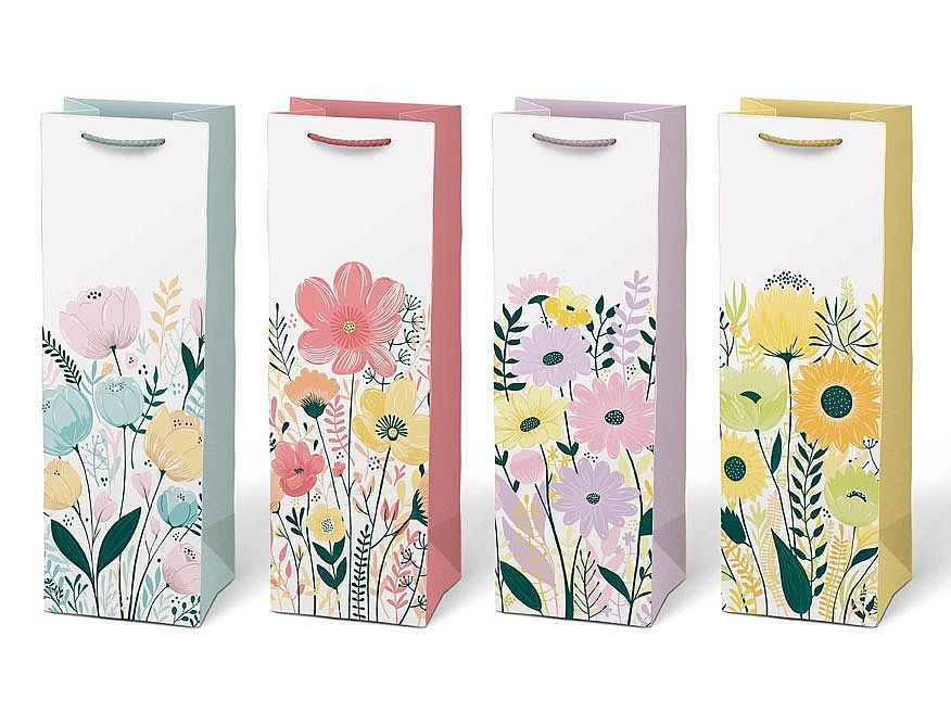 Decorațiuni florale în pastel, cu mânere rezistente și margine întărită, ideale pentru oferirea elegantă a unei sticle.
