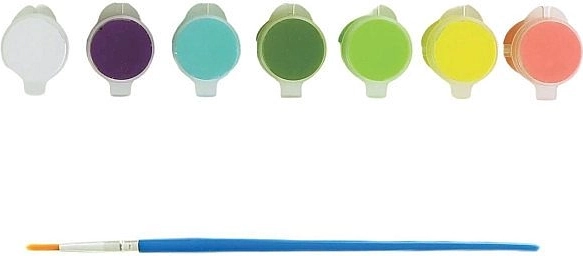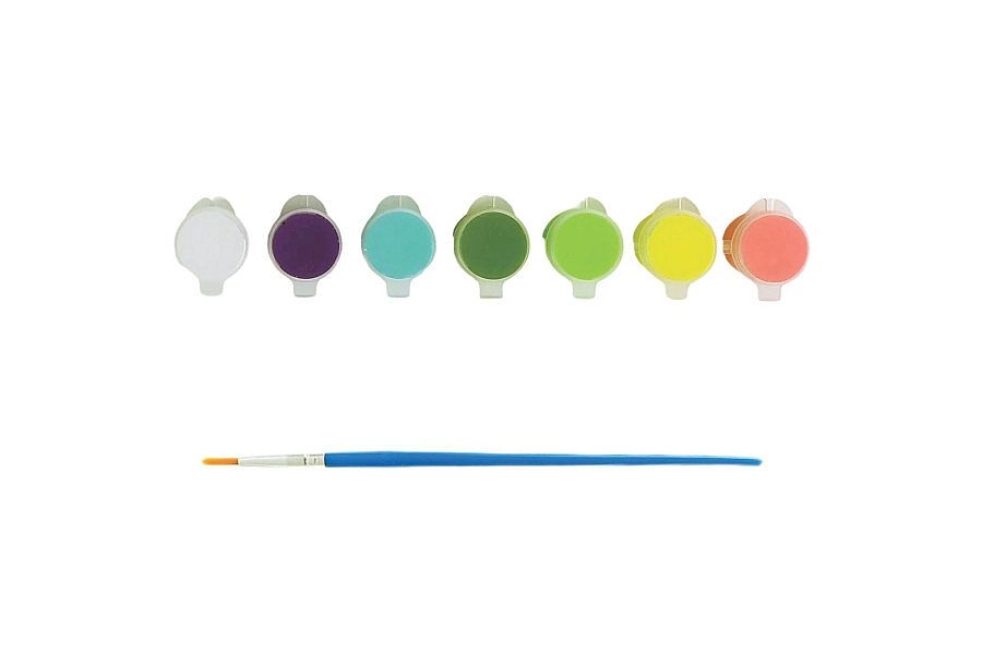 - Pachet complet – pânză 20,3 × 28 cm, 7 recipiente cu culori acrilice, 1 pensulă.