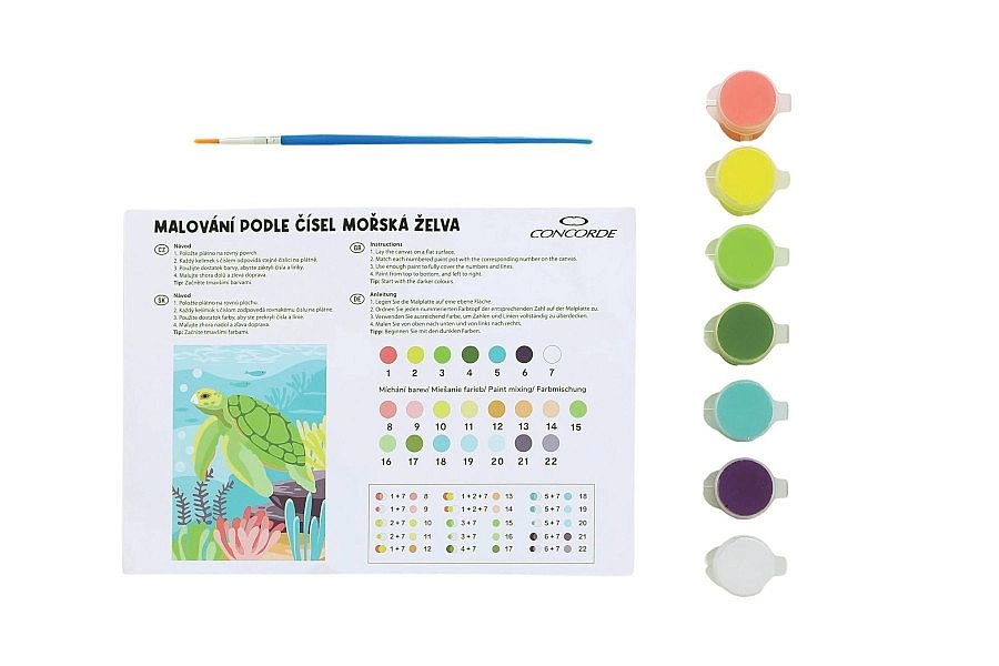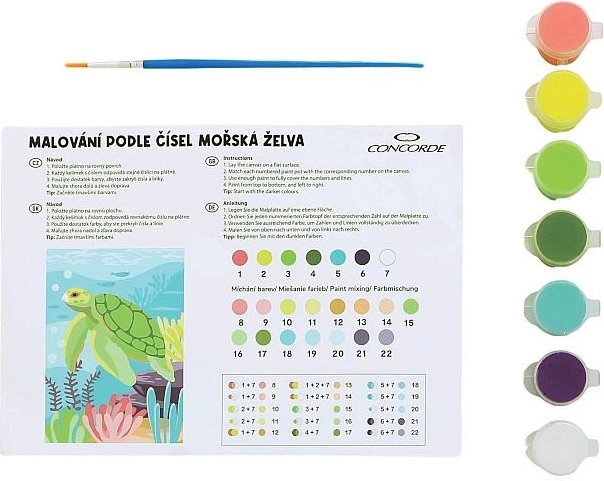 Descoperă creativitatea relaxantă cu setul pictură după numere CONCORDE, cu motivul broaștei țestoase de mare. Ideal atât pentru începători, cât și pentru avansați – este suficient să urmezi modelul numeric și să privești cum prinde viață în fața ta un tablou frumos. Găsești totul în pachet: pânză 20,3 × 28 cm, 7 culori acrilice și pensulă.