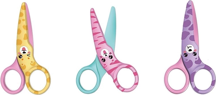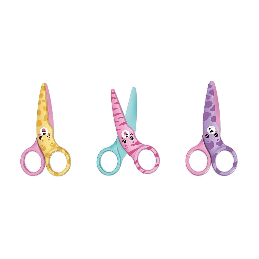 Vesele foarfeci de siguranță pentru copii, cu motive de animăluțe, lungime 10,5 cm, ideale pentru primele activități creative. Au lamă nemetalică, vârf rotunjit și mâner ergonomic din plastic pentru tăiere confortabilă și sigură, chiar și pentru cei mai mici. Disponibile în culori asortate.