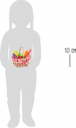 Acest set de calitate include un coș împletit cu țesătură în carouri și piese din lemn reprezentând fructe și legume (căpșuni, morcov, vânătă, știulete de porumb, măr, banană etc.). Piesele sunt unite cu scai, astfel încât copiii le pot „tăia” în siguranță cu cuțitul de lemn și le pot reuni din nou. Un accesoriu perfect pentru bucătăria de jucărie și standul de cumpărături.