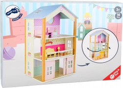 Această căsuță elegantă pentru păpuși, cu bază rotativă, transformă fiecare joc într-o poveste fermecată. Datorită discului rotativ, întreaga casă este ușor accesibilă din toate părțile, astfel încât se pot juca simultan și frații. Oferă trei etaje, dotări bogate, inclusiv 15 piese de mobilier din lemn, uși glisante și pereți decorați prin imprimare. Potrivită pentru păpuși de până la 12 cm, realizată din lemn de calitate pentru durabilitate și joacă în siguranță.