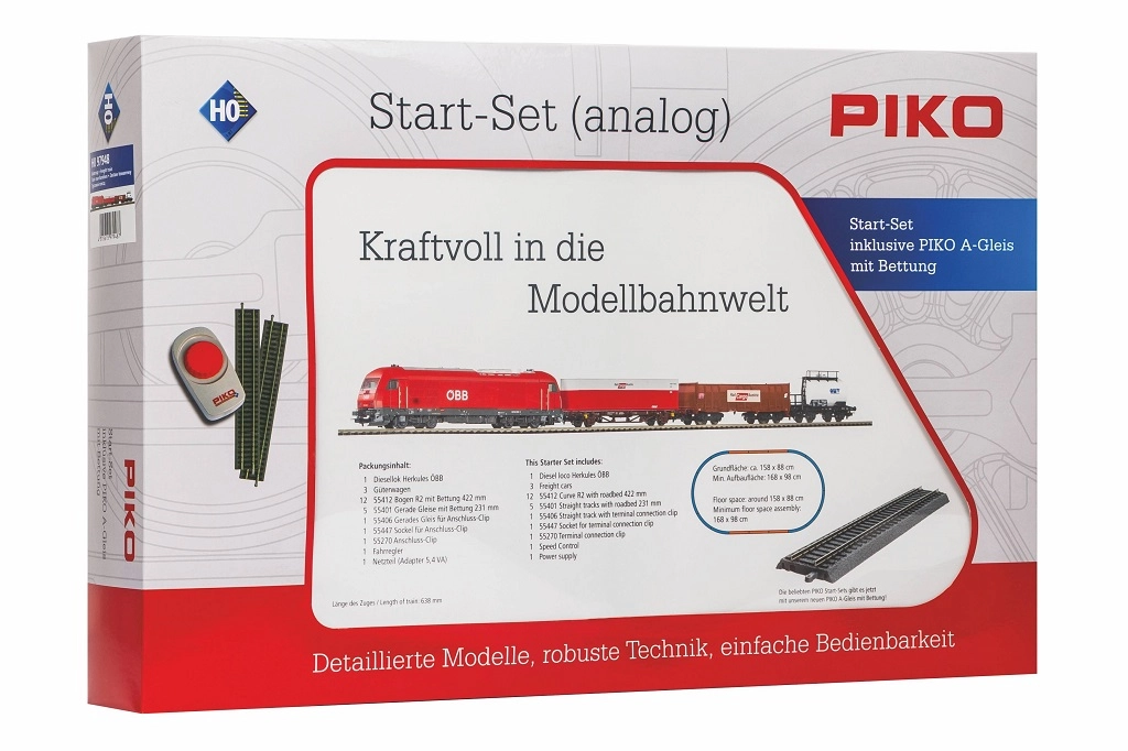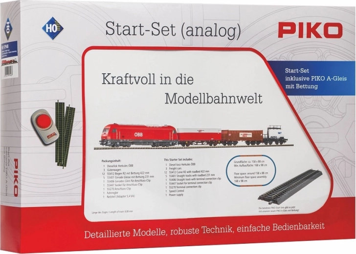 Acest set de start PIKO aduce un model feroviar realist la scara H0, cu accent pe punerea rapidă în funcțiune. Locomotiva ÖBB Hercules impresionează prin execuția fidelă, iluminarea albă dependentă de direcție și rularea lină în exploatare analogică DC. Este inclusă și o figurină de mecanic pentru un aspect și mai autentic al cabinei.