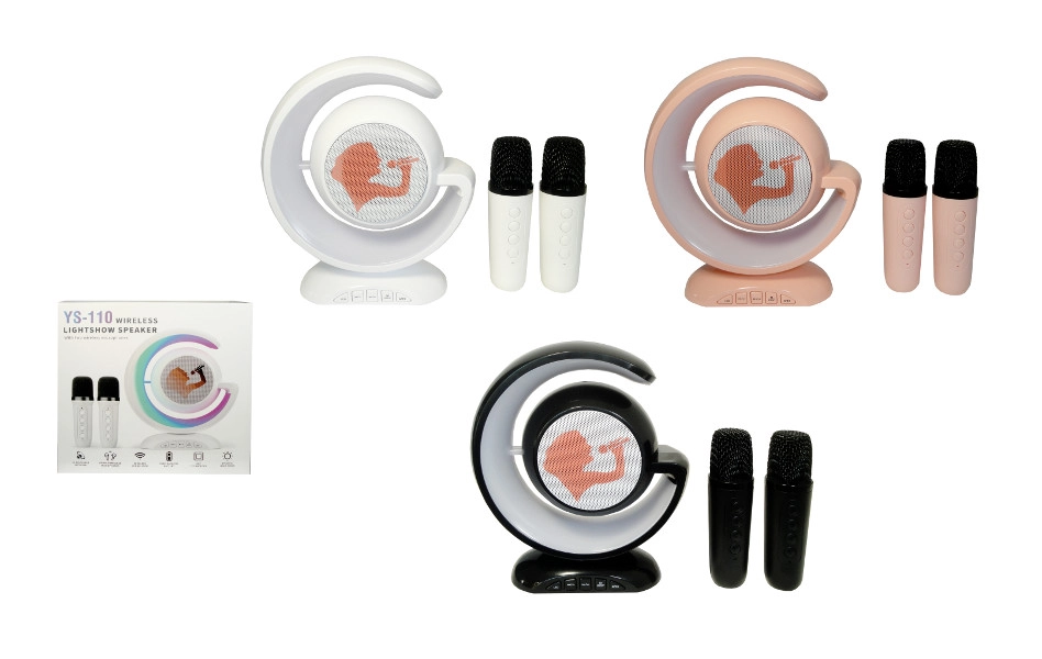 Un set karaoke wireless distractiv, cu difuzor în formă de semilună și două microfoane, transformă orice petrecere într-un spectacol. Oferă conectivitate Bluetooth, efecte luminoase și baterie litiu reîncărcabilă inclusă. Disponibil în mai multe variante de culori (trimise aleatoriu).