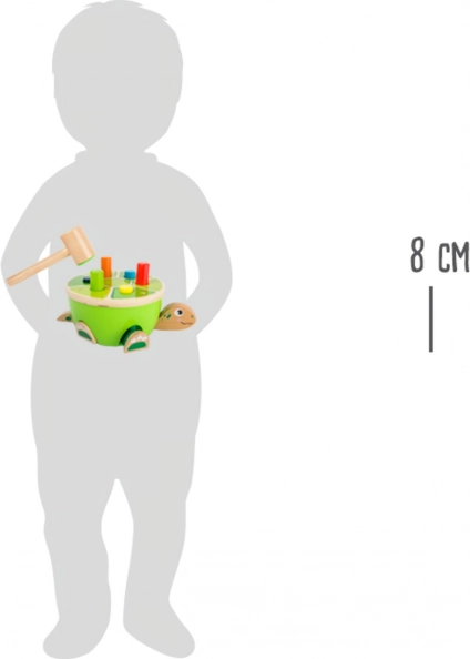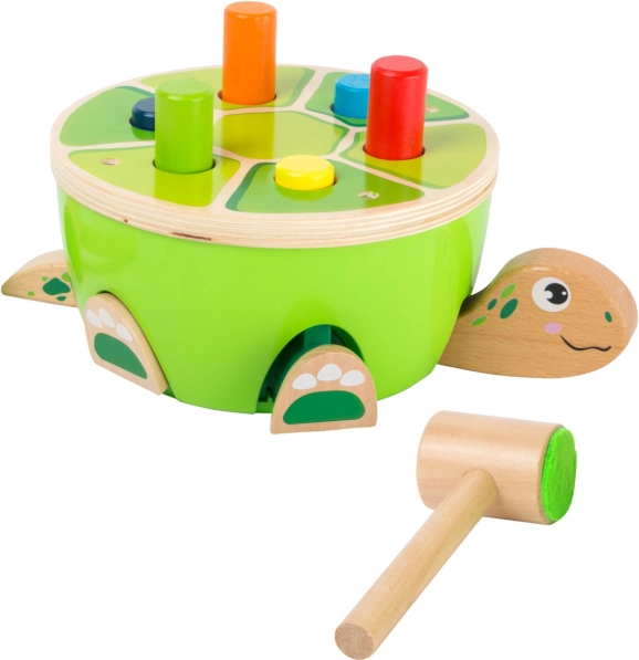 Țestoasa cu știfturi colorate îi atrage pe cei mici într-un joc mecanic isteț: când bat un știft, altul se ridică automat. La fiecare lovitură se extind picioarele, capul și coada țestoasei, astfel încât fiecare ciocănit este răsplătită cu un efect amuzant și feedback imediat.