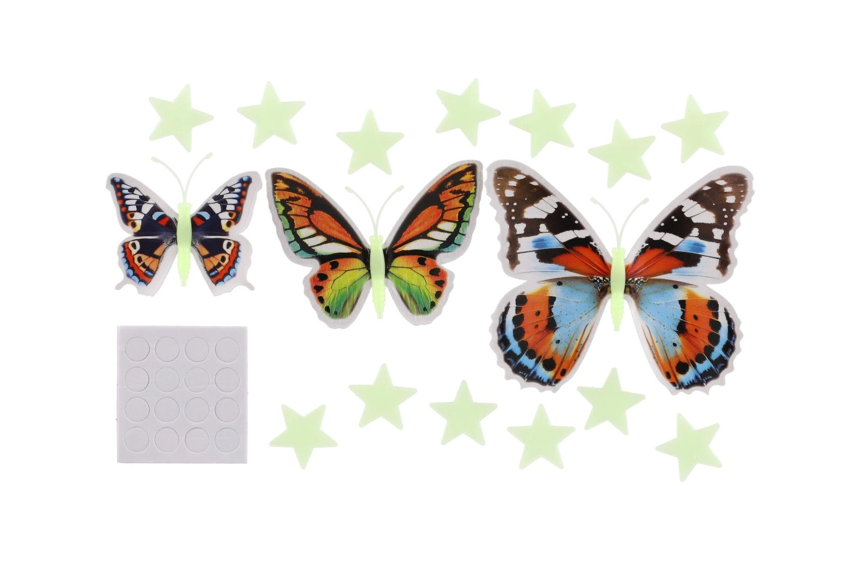 Instalarea durează doar un moment – datorită discurilor autoadezive incluse le lipești pe perete, mobilier sau tavan fără unelte și fără găurire. Poți aranja fluturii și stelele în mod liber și să creezi o compoziție originală exact după imaginația ta.