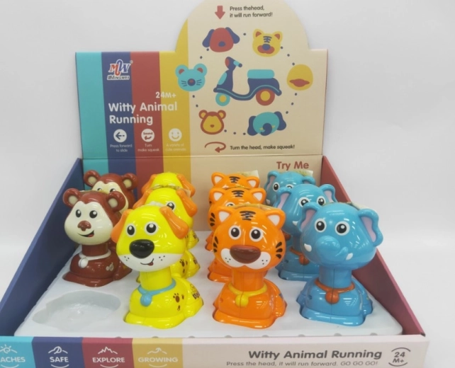 Un animăluț drăguț pe roți, cu lungimea de 13 cm, va încânta orice copil. Doar apasă capul în jos și animăluțul pornește. Sunt disponibile 4 variante – câine, elefant, maimuță și tigru. O alegere excelentă pentru dezvoltarea motricității și distracție acasă sau în călătorii.