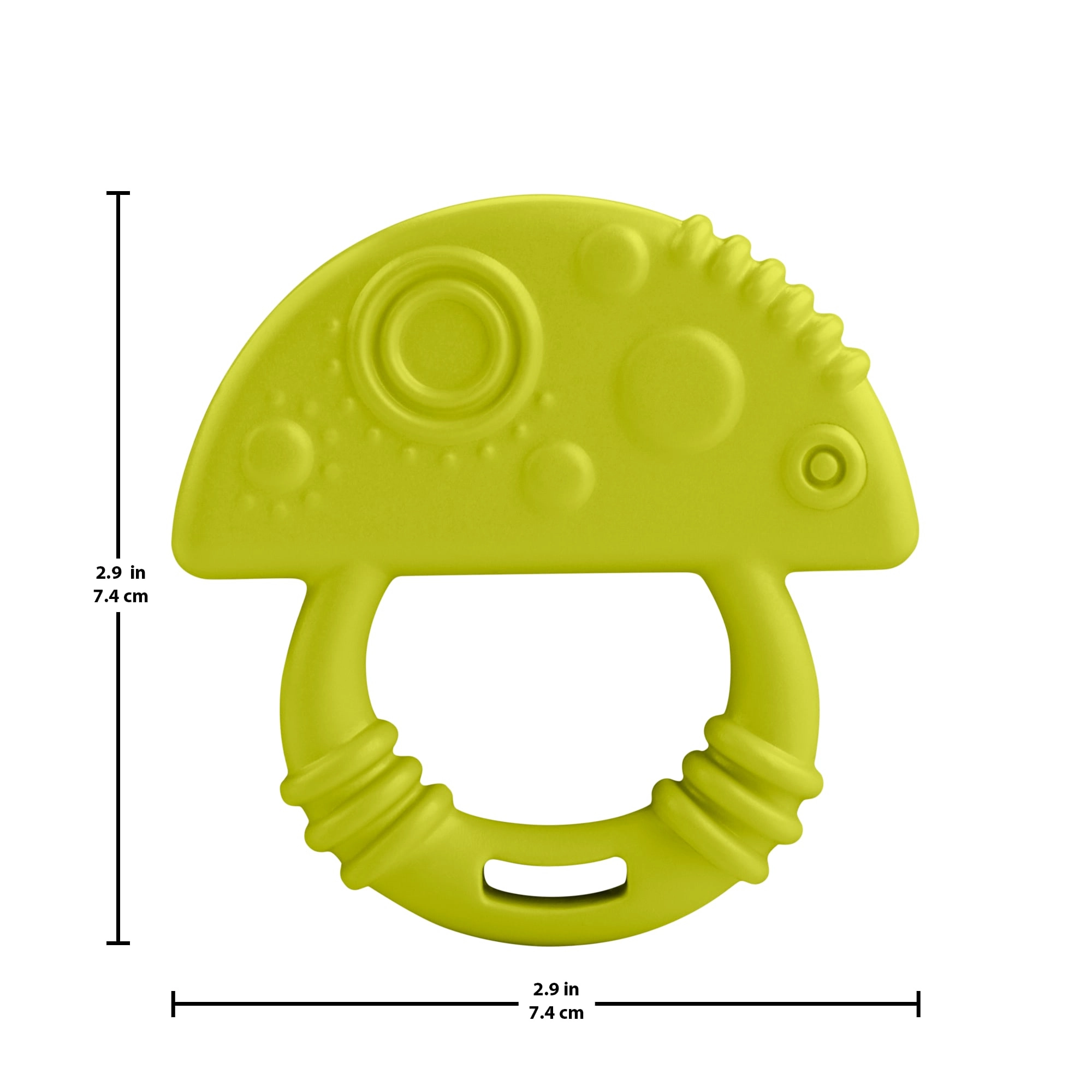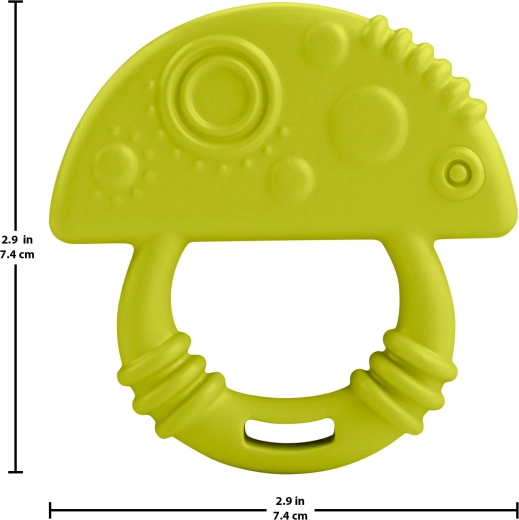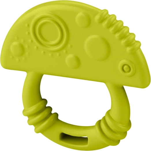 Jucăria de dentiție în formă de ciupercă drăgălașă, în culoare verde, este concepută pentru o prindere confortabilă și un joc natural care sprijină coordonarea mână–ochi și motricitatea fină. Materialul moale și flexibil este plăcut la atingere și sigur pentru mușcatul zilnic.