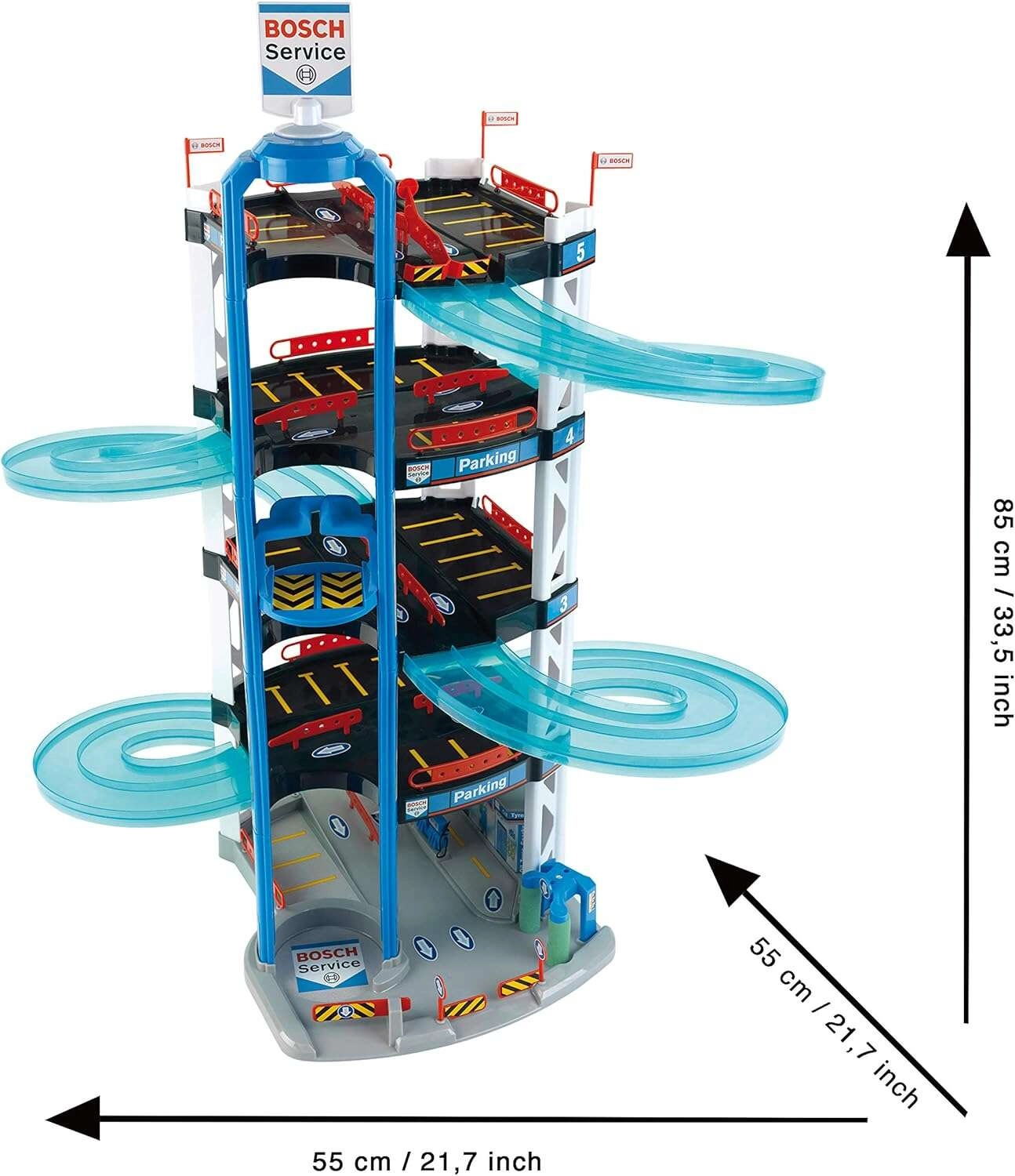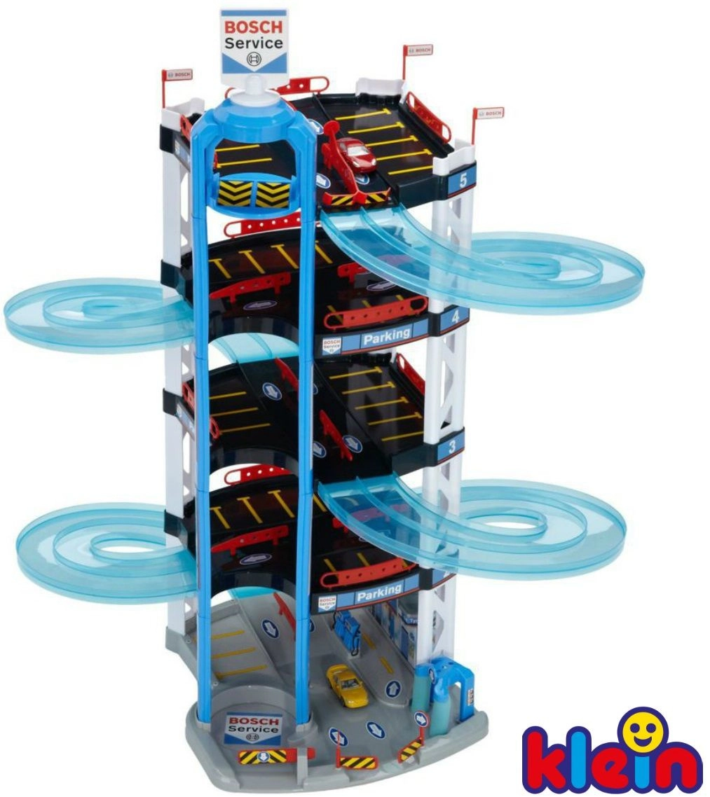 Acest complex robust de parcare pe 5 etaje BOSCH Service de la brandul Klein este creat pentru micii piloți. Oferă rampe spiralate duble semitransparente de la ultimul etaj până jos, lift acționat manual pentru transferul mașinuțelor între niveluri și start/finish de cursă pentru două mașinuțe. Pe fiecare nivel găsești suficiente locuri de parcare, iar la parter în plus zonă de service cu „stație” pentru joc realist.
