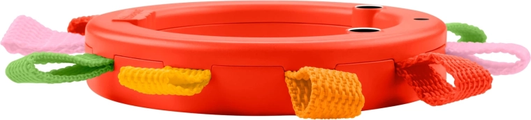 Inelul compact din plastic, cu multiple bucle textile colorate, se ține excelent în mâna copilului și încurajează primele încercări de prindere și de transfer dintr-o mână în alta.