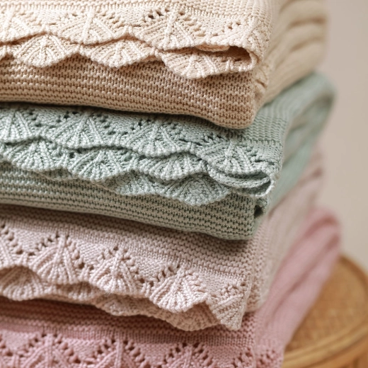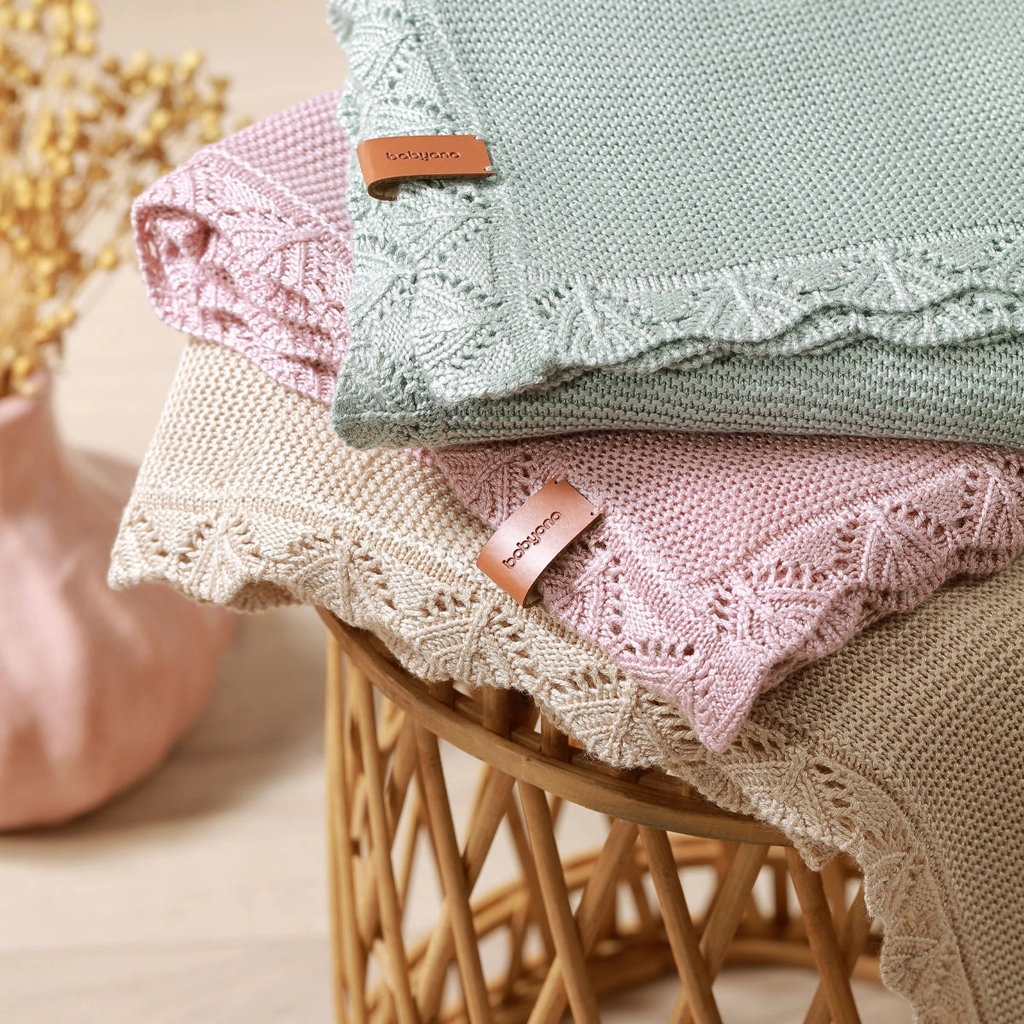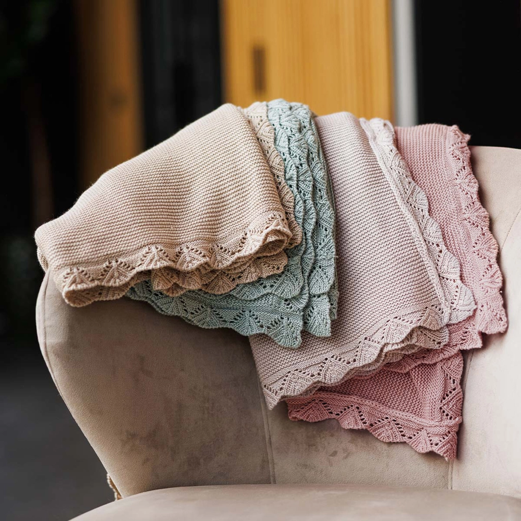 Roz fin, margine decorativă și dimensiunea de 75 × 100 cm o fac un accesoriu ideal pentru cărucior, pătuț și călătorii.