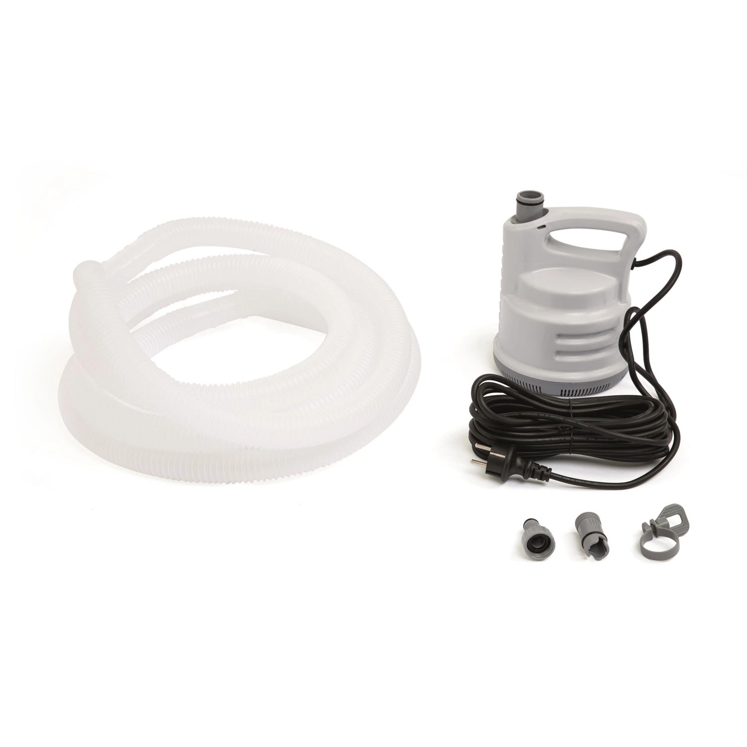 Pachetul conține tot ce aveți nevoie pentru utilizare imediată – furtun de evacuare de 5 m, adaptoare pentru furtun de grădină și clemă pentru conectare sigură. Alimentarea la 220–240 V și puterea de 80 W fac ca pompa să fie eficientă energetic și totodată suficient de performantă pentru golirea rapidă a apei din piscină.