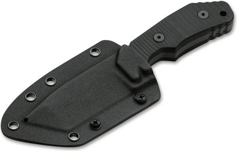 Mânerul ergonomic, parțial striat, din G10 în variantă neagră stă ferm în mână chiar și în condiții solicitante. Datorită ochiului pentru șnur și clemei de curea, ai cuțitul mereu la îndemână. Este inclus un toc Kydex de calitate pentru purtare sigură și discretă. Pentru utilizatorii creativi, este posibilă imprimarea facilă a plăselelor alternative pe imprimante 3D obișnuite, în diverse forme, culori și materiale.