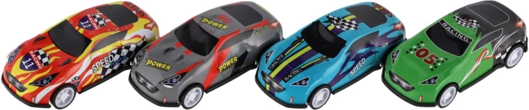 Fiecare mașinuță are o culoare puternică și imprimeuri cu tematică de curse, care stimulează imaginația și fac cursele și mai distractive.