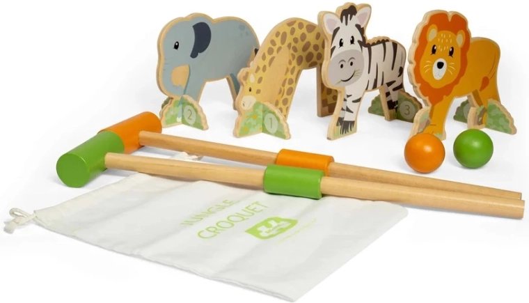 Croquetul pentru copii Junglă aduce distracție atemporală într-un design modern. Patru porți vesele cu animale (leu, hipopotam, elefant, girafă), două mingi colorate și două ciocănele rezistente formează setul perfect pentru joc în interior sau în aer liber. Ciocănelele pot fi deșurubate în două părți, iar totul se depozitează ușor în săculețul din bumbac inclus – ideal pentru călătorii și ordine rapidă.