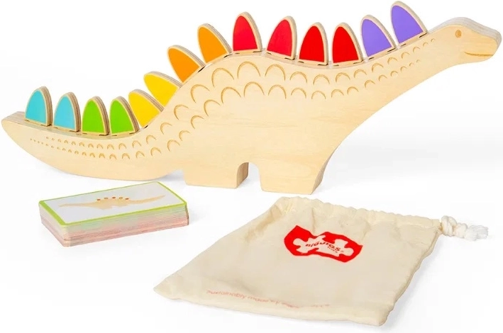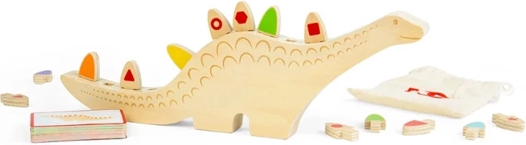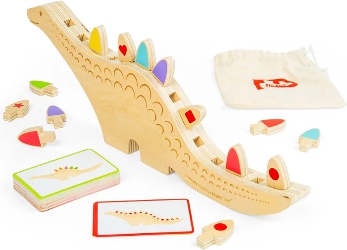 Acest joc creativ de echilibru și sortare cu tematică de dinozaur aduce zeci de scenarii de joacă. Copiii pot asocia pe culori sau forme conform instrucțiunilor de pe carduri sau pot încerca să echilibreze și să aranjeze piesele în canelurile de pe spatele dinozaurului. Jocul deschis susține autonomia, concentrarea și răbdarea.