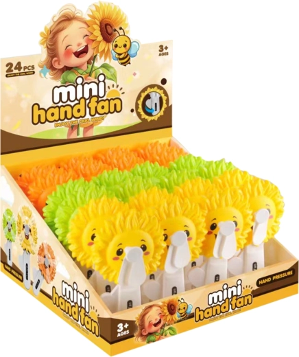 Ventilator de mână distractiv și practic în formă de floarea-soarelui pentru răcorire rapidă în zilele toride. Mecanism mecanic cu volant fără baterii, elice din plastic sigură și operare ușoară prin apăsarea manetei – ideal pentru copii și adulți, în călătorii, excursii sau la apă.