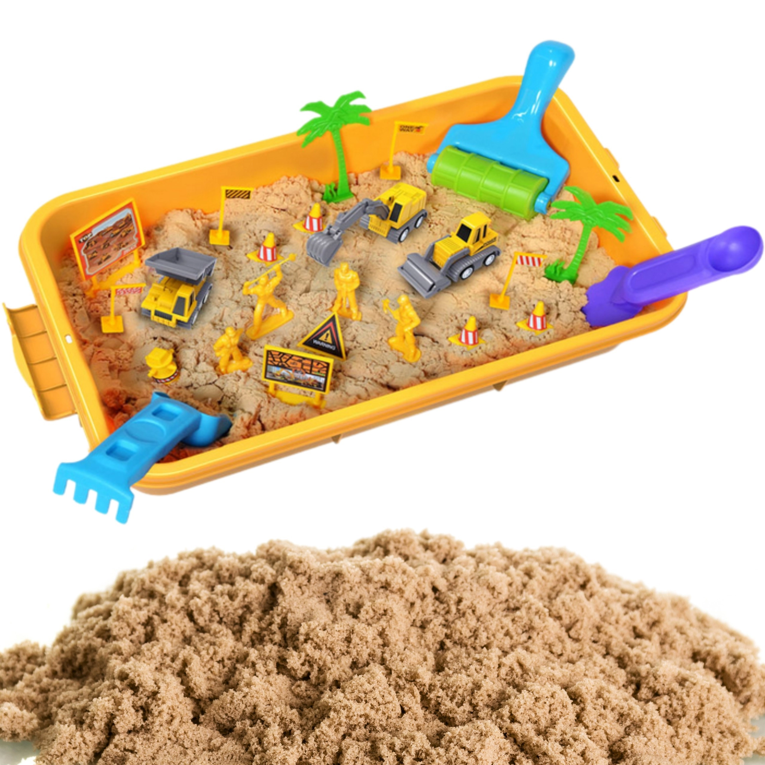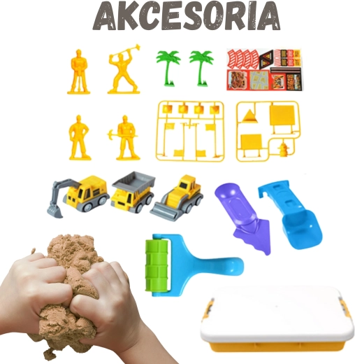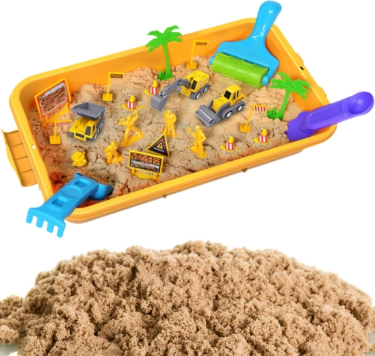 - Conținutul pachetului: geantă galbenă, 1 000 g de nisip kinetic (culoare naturală), 3 vehicule de construcții, 4 figurine muncitori, elemente rutiere și de avertizare (conuri, bariere), 2 copăcei (palmieri), unelte pentru nisip: lopățică, spatulă/greblă mică, roliță manuală.