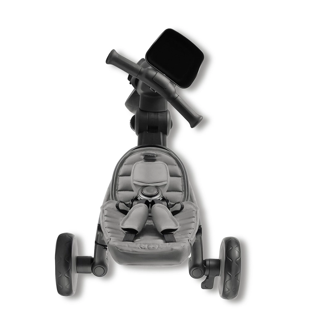 Centurile ajustabile în trei puncte, bara de siguranță detașabilă și frâna spate păstrează micul pasager în siguranță, în timp ce șezutul moale și copertina asigură confortul.