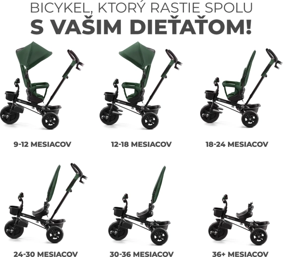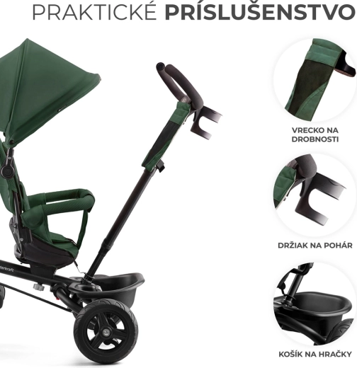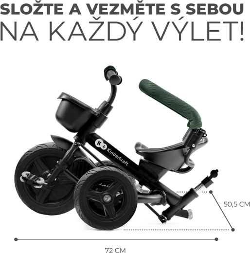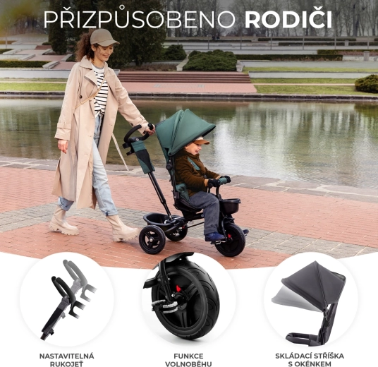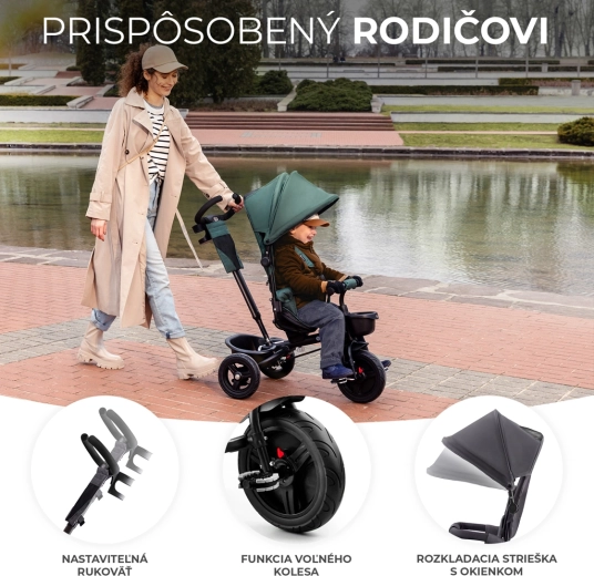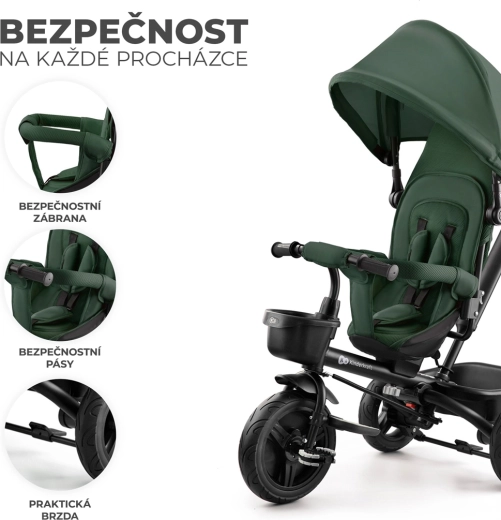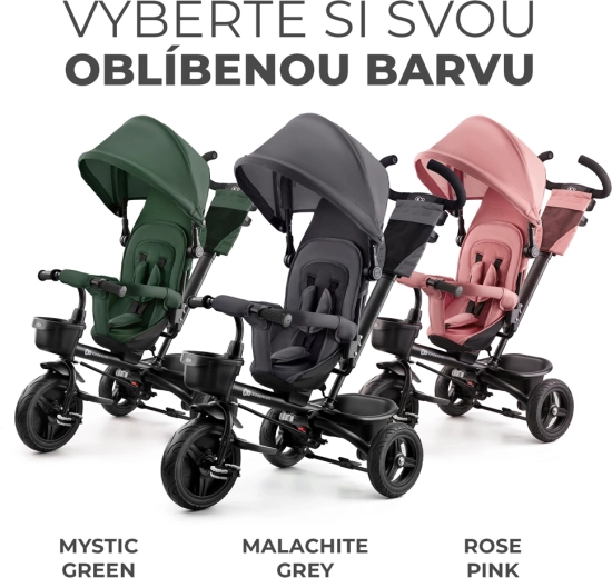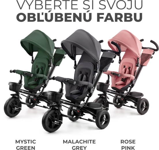 Tricicleta pentru copii Kinderkraft Aveo în culoarea Mystic Green este o soluție inteligentă pentru copiii de la 9 luni până la aproximativ 5 ani. Oferă scăunel rotativ, orientat atât spre față, cât și spre spate, roți antipana, fără întreținere pentru diverse tipuri de teren și pliare rapidă pentru transport și depozitare ușoare. Pentru siguranță maximă, include centuri în 3 puncte, bară de siguranță și spătar înalt. Părinții vor aprecia mânerul reglabil cu posibilitate de blocare a direcției și accesoriile practice, inclusiv coșulețe și suport de băutură.