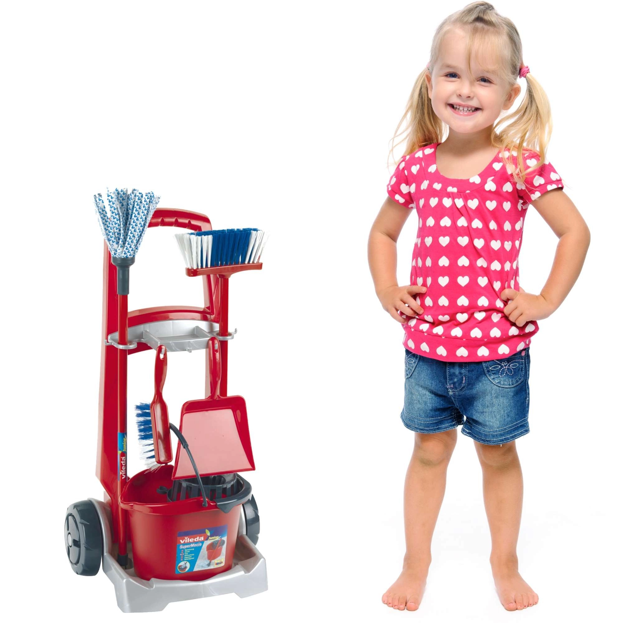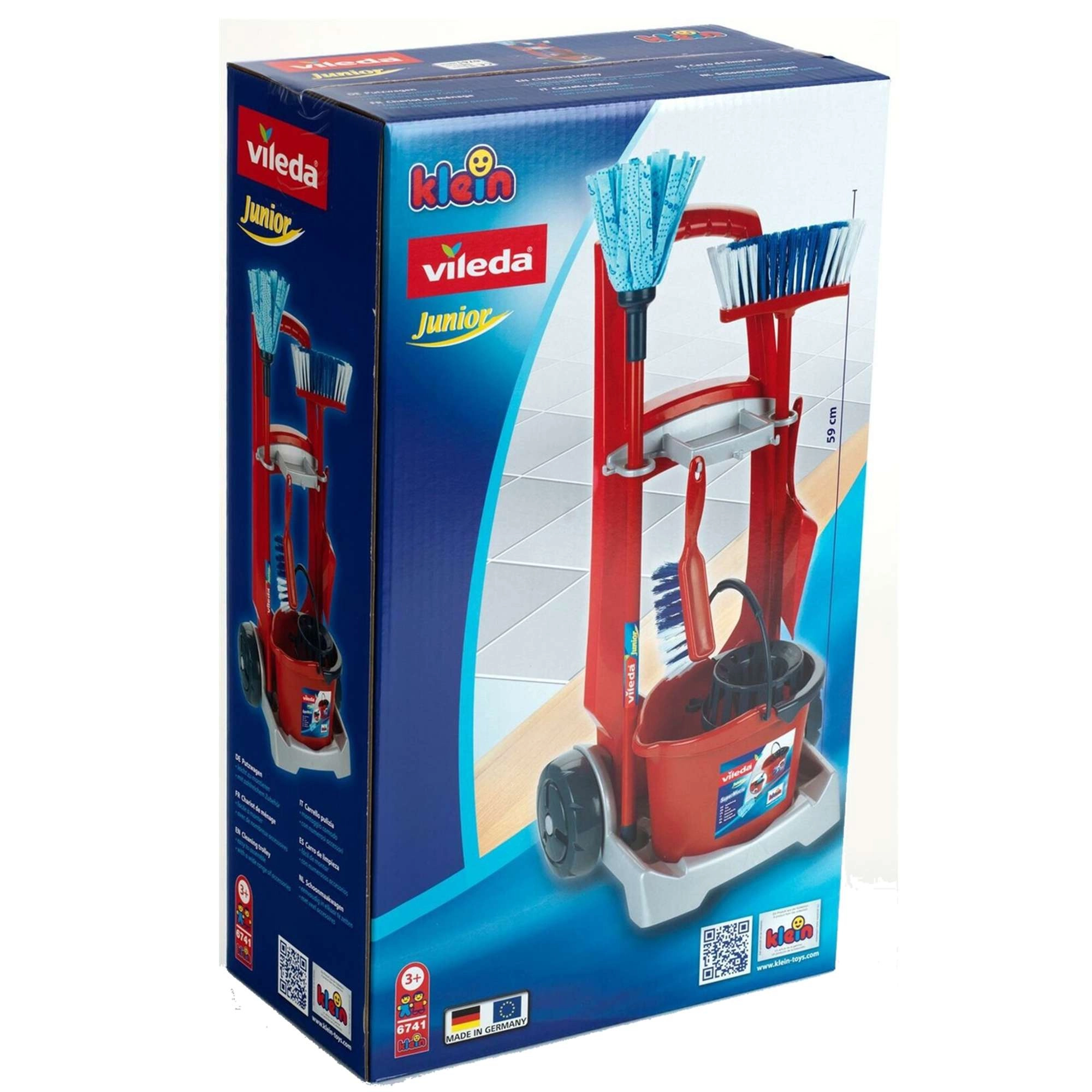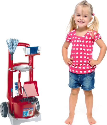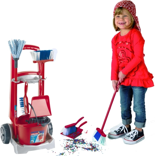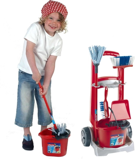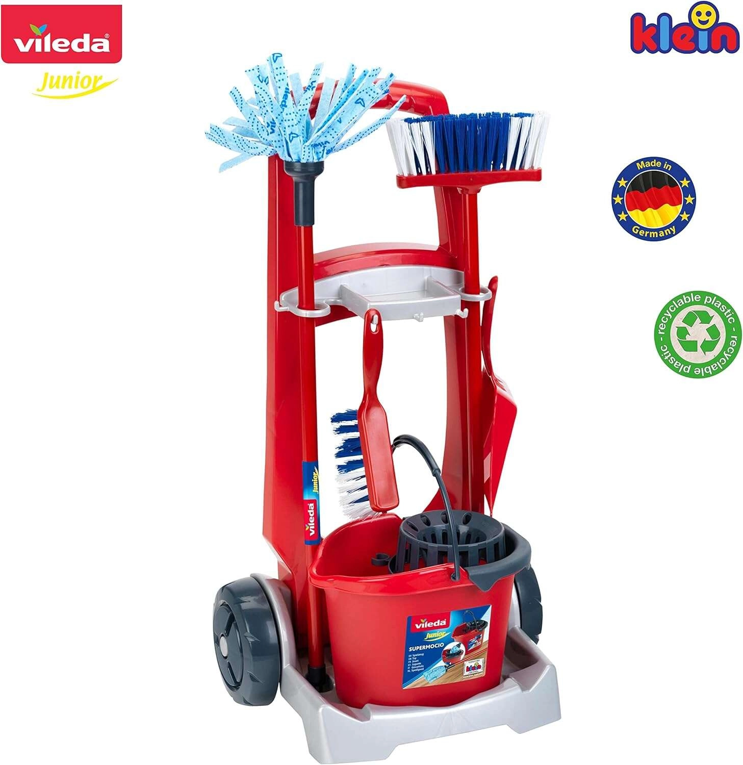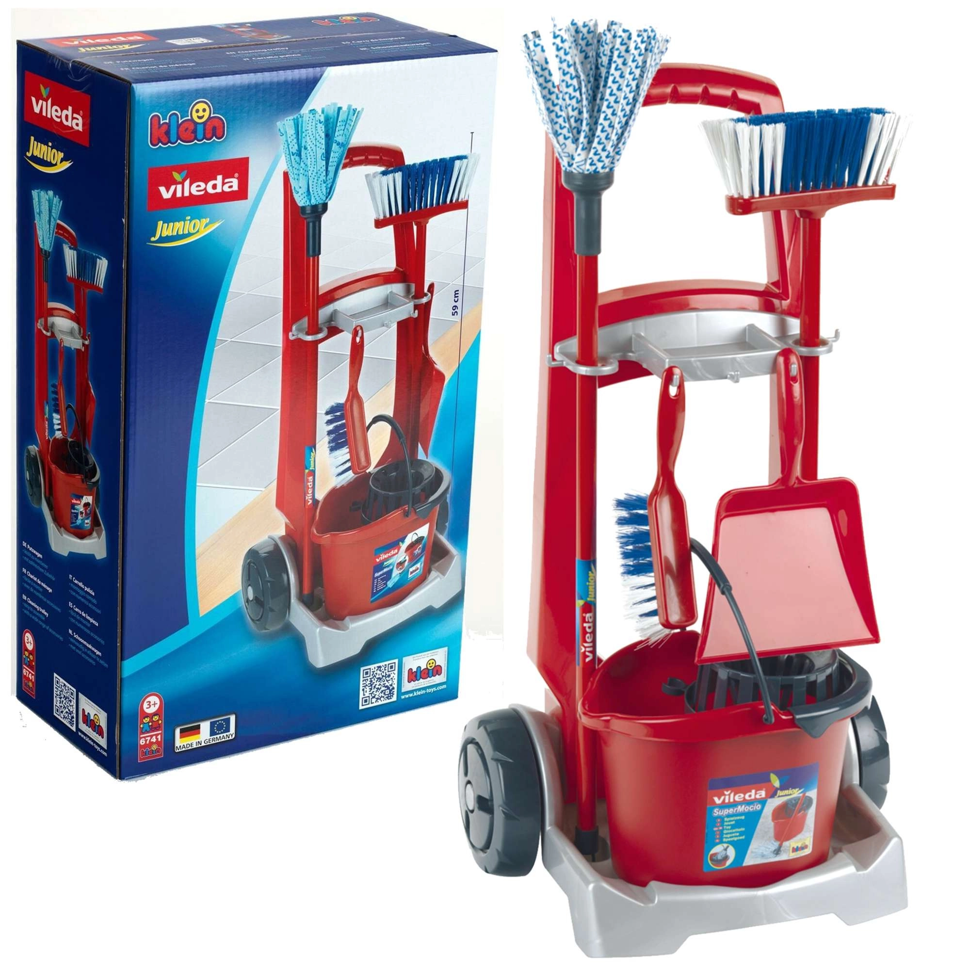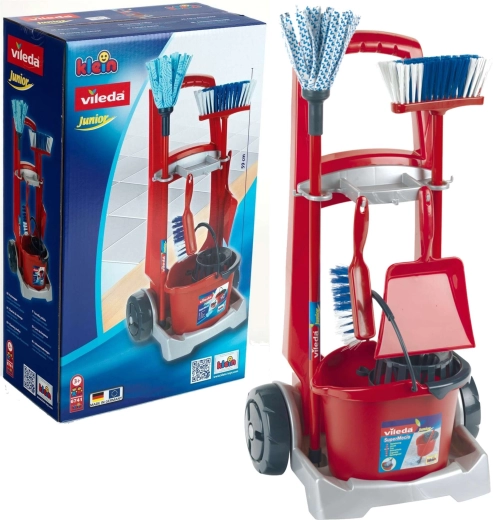 Căruciorul de curățenie pentru copii Vileda de la brandul Klein este un set bogat echipat pentru jocuri realiste de gospodărie. Conține un cărucior pe roți, găleată cu coș stoarcător, mop, mătură, perie de mână și făraș. Susține jocul de rol, îi învață pe copii ordine și responsabilitate și, datorită construcției rezistente, garantează durată lungă de viață.