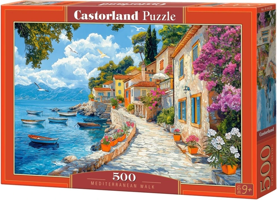 Bucură-te de relaxare cu un peisaj frumos la mare – puzzle-ul CASTORLAND „Plimbare mediteraneană” oferă 500 de piese, imprimare de calitate și asamblare plăcută cu dimensiunea finală de 47 × 33 cm.