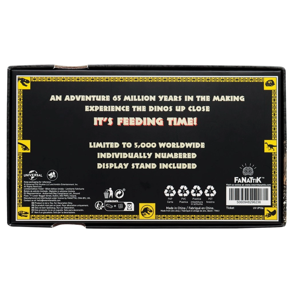 Detaliile decorative, precum data și locul evenimentului stilizate, conferă biletului credibilitatea unui permis cinematografic. Datorită dimensiunilor compacte, îl depozitezi ușor în portofel, cutie sau pe raft. Este un cadou perfect pentru iubitorii sagăi cu dinozauri, un accesoriu grozav lângă alte obiecte licențiate și o piesă remarcabilă pentru colecție.