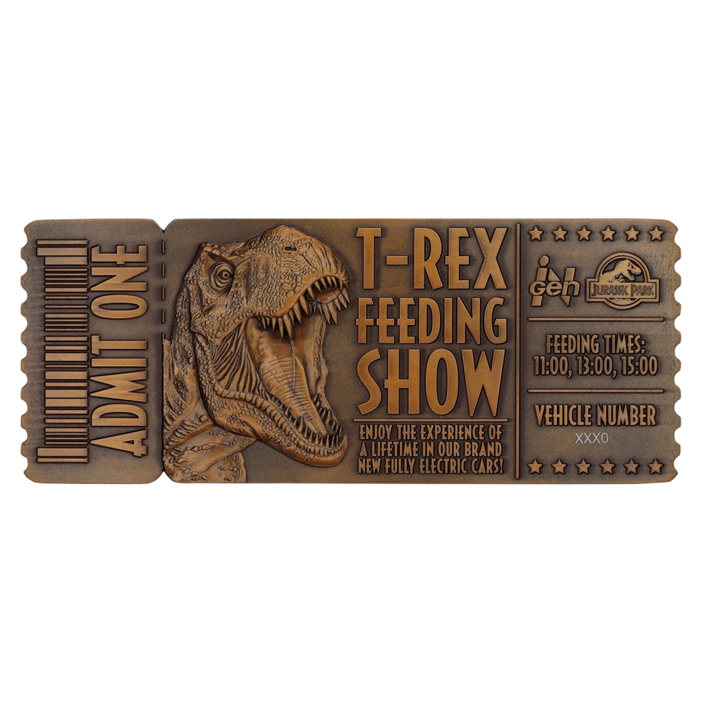 Această replică premium a biletului din filmul legendar JURASSIC PARK este realizată din metal, cu o suprafață elegantă, lucioasă. Designul se inspiră din identitatea vizuală iconică a seriei – tonuri pământii de maro și verde care creează atmosfera de junglă și aventură. Logo-ul Jurassic Park dominant subliniază aspectul oficial și valoarea colecționabilă.