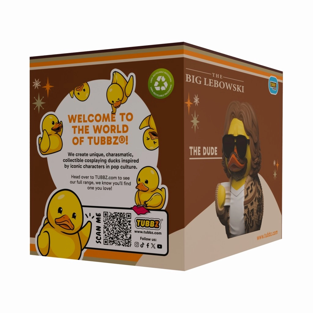 Această rață TUBBZ licențiată îl transformă pe The Dude într-o figurină din cauciuc stilizată, cu un aspect elaborat – de la halatul bej tipic până la ochelarii de soare și părul ciufulit. Datorită execuției de calitate și picturii detaliate, este o piesă de impact pentru orice colecție a fanilor filmului Big Lebowski.