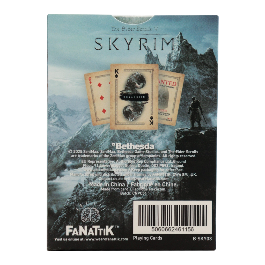 Cărțile au dimensiune standard și suprafață netedă pentru o amestecare și distribuire fluide. Simbolurile tradiționale ale cărților sunt subtil ajustate pentru a se potrivi esteticii fantasy Skyrim – ideale atât pentru seri de joc acasă, cât și pentru colecție.