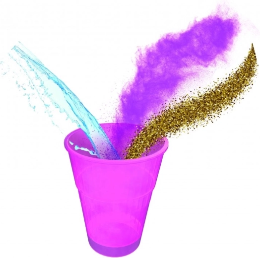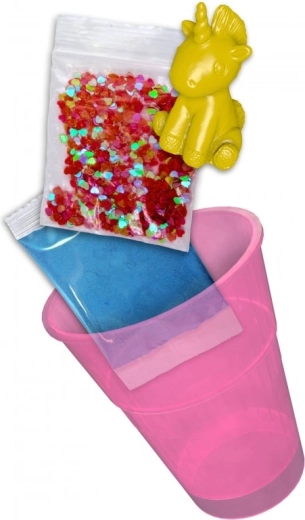 - Pahar cu slime pudră, decorațiuni (sclipici, steluțe, inimioare, fulgi aurii), instrucțiuni, animăluț moale – surpriză
